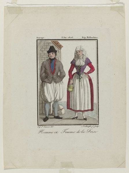 Editor: This print, "Paar in Friese klederdracht," or "Couple in Frisian Costume," was created sometime between 1803 and 1807 by Ludwig Gottlieb Portman. It looks to be an engraving, and the romantic style seems fitting for the time period. What strikes me is how formally the couple is presented. What are your thoughts on this piece? Curator: Oh, yes, the Frisian couple. It whispers of a time when local dress wasn’t just clothing, but a walking, talking identity card! It makes me wonder, doesn't it, about how intensely people identified with their region back then? The formality…it's almost theatrical, isn't it? He, with his little box—possibly filled with something delicious?—and she, a tower of fabric and lace. Almost comically proper. The Romantic period wasn’t always about swooning landscapes; sometimes it was about preserving and celebrating local flavour, with a tiny bit of playful exaggeration. I can almost smell the salty air. What do *you* feel when you see them? Editor: I see what you mean. I was so focused on the formal aspects I missed the sense of pride in their local identity. That was really interesting. Curator: Exactly! Now, *I’m* wondering how we've shed our unique cultural garb in exchange for… jeans? Maybe time for a fashion rebellion?