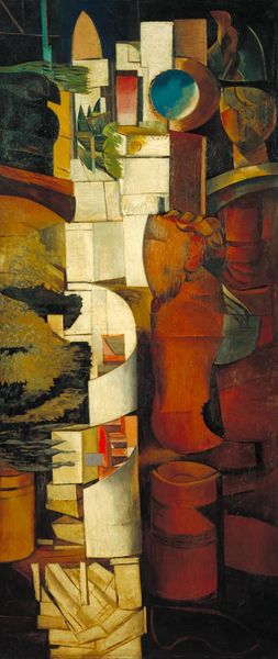 Curator: Let's explore "The Violin," a Cubist oil painting realized around 1914 by Juan Gris. Immediately I'm noticing the muted color palette and those geometric, almost architectural forms—it presents a stillness, almost melancholy to my eye. Editor: Melancholy, that's it! I was struggling to place the feeling. It's as if Gris has trapped the soul of music inside these angular fragments. What's particularly interesting to me is the use of symbols, such as how musical instruments, like the violin here, have been represented in art over centuries. Can we unlock what he wants us to consider? Curator: Undoubtedly, symbols resonate deeply. Gris deconstructs the familiar form of the violin—a traditional symbol of harmony—presenting it through fractured planes and distorted perspectives. We recognize it as a violin, but also as something more conceptual. There is the breakdown, the loss—a commentary perhaps on the changing landscape of art and perception in the early 20th century. Editor: The painting feels like a memory, perhaps even an illusion of one. I wonder, what of melody and coherence? Could we imagine the sound escaping this broken vessel? Curator: I imagine so. Perhaps Gris is also pointing to a new harmony—one born out of disruption and abstraction. Notice how he uses different textures, the interplay between the solid dark elements against the lighter hues. They add complexity to what at first appears a fairly simple composition. Editor: I agree. The subtle shifts create an incredible richness. Ultimately, it has opened something that seems hidden beneath those formal layers—a whole vista of emotion and implication is opened. Curator: Well said!
