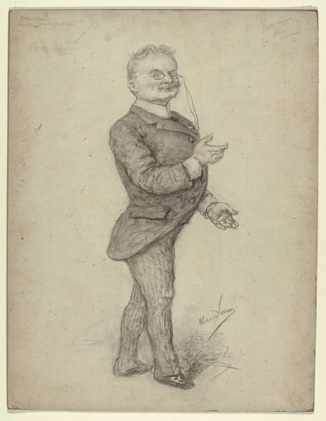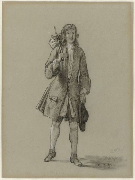 Editor: This print by Louis Jaugey, titled "Jongen staand naast een troon," likely made sometime in the latter half of the 19th century, depicts a boy in elaborate costume standing near what looks like a throne. The engraving has this romantic flair to it, but the boy’s somewhat melancholic expression is interesting. What strikes you when you look at this? Curator: It's fascinating how Jaugey uses caricature in what appears to be a genre painting. The overt theatricality, his flamboyant costume, coupled with the prop throne—these are meant to convey status, perhaps mockingly so. What's key is the social context of this imagery. In the 19th century, there was a huge fascination with theatre and celebrity culture, and engravings made art accessible. Editor: You're saying this print allowed broader audiences to engage with this theatrical world? Curator: Precisely. Prints circulated widely. Notice how the inscription references "Le Chevalier Bijou" and "Chatte Blanche." These were probably popular plays or characters. It makes me wonder, was the boy some sort of child star? What did it mean to portray someone like this at that specific moment in time? It all ties into understanding the relationship between art, fame, and social identity. Editor: That’s a good question. So, instead of just seeing a portrait, we can consider what it meant to portray a child celebrity in this era, and how printmaking democratized access to that image. Curator: Exactly! By focusing on the circulation and reception of this work, we gain insight into the broader cultural landscape and the politics of representation in 19th century France. This wasn’t simply art for art’s sake. This was popular culture, designed for consumption and shaped by socio-political forces. Editor: I see what you mean. I initially focused on the aesthetic elements, but understanding the context gives it so much more meaning. Curator: Indeed. And thinking about how a print like this interacts with a public opens all sorts of new avenues for interpretation.