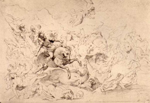 Albrecht Durer created this work, titled "Abduction," using ink, and what immediately strikes us is the frenetic energy captured through the intricate linework. The composition is a swirl of figures—human and equine—caught in a violent act. Durer's cross-hatching not only defines form but also conveys a sense of chaotic movement. The figures, though classical in their nudes, are rendered with a dynamism that pulls from both observation and imagination. We must look at how the lines create depth and texture, giving weight to the figures. This work can be seen as a meditation on power, force, and the disruption of established order. Durer’s use of line to convey drama and intensity turns what could be a classical subject into a profound exploration of human and mythological conflict.