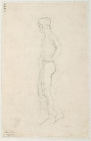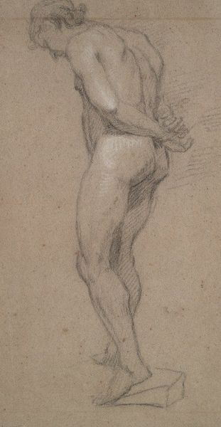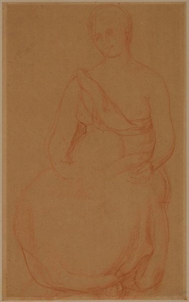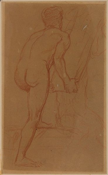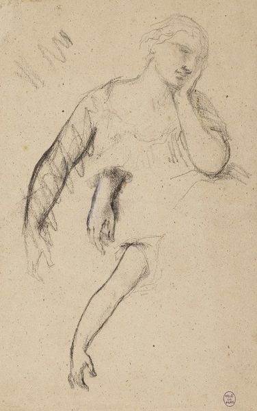 Curator: Looking at this work, I immediately notice a feeling of gentle melancholy. Editor: That's interesting. This drawing, "Etude de nu," by Narcisse-Virgilio Diaz, presents a nude figure executed in dry media, characteristic of the academic art tradition. The pose and the landscape style, despite its fragmented presentation, invoke classical ideals, wouldn't you say? Curator: Absolutely, the artist is clearly engaging with a lineage of classical representation, particularly in the depiction of the human form. The positioning of the hand near the face has always symbolized contemplation, even self-reflection, evoking centuries of such portrayal. Yet, the incompleteness, the suggestion rather than clear depiction, seems to invite a quiet, almost vulnerable emotional response from the viewer. The muted colors help to make the emotion felt rather than spelled out, tapping a deep well of shared human experience. Editor: True, the economy of line is striking. The figure's contour seems almost tentative, as if Diaz were mapping not just physical form but also capturing an ephemeral mood. Note how the artist utilized red chalk to compose the figure, contrasting against the beige paper tone, yielding an array of hues by virtue of omission as much as commitment. Curator: And in terms of cultural memory, these nude studies were often exercises in idealization, attempting to distill essential elements of beauty and human form. We have an immediate reference to Venus Pudica or many depictions of Eve but softened through the lens of romantic subjectivity. It feels like Diaz sought not only to portray the physical but also the psychic, the psychological interiority of the model through minimal expression. The hands, seemingly appearing out of nowhere, suggest the mind at play. Editor: The gesture's significance cannot be understated, but, focusing on just form and placement, consider how that raised, partial limb, the hand as mere shape at the top, establishes a kind of spatial dissonance that arrests the eye. It serves no representational purpose except to highlight, by interruption and incongruity, the delicate naturalism that he aims to achieve, especially along the waist, the curvature, the articulation of light around the thorax... Curator: The whole work reverberates, finally, like a whispered thought. Editor: Indeed. The figure's silence almost prompts the viewer to provide the unspoken narrative to fill the unpictured expression.
