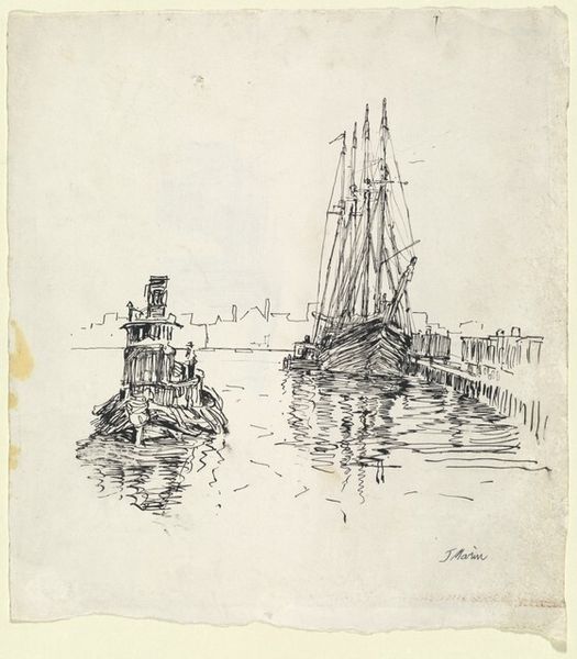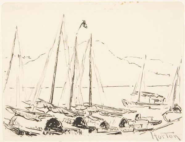 Paul Signac rendered "Sejlskibe i Barfleurs havn" with ink and wash on paper. This artwork offers a glimpse into the cultural and economic realities of coastal life at the turn of the 20th century. The scene captures the essence of Barfleur's harbor, a place of daily labor and maritime heritage. Signac, known for his neo-impressionist landscapes, here uses a more subdued palette which evokes a sense of the everyday, moving away from the formal and towards a more spontaneous representation. The presence of these boats is central to understanding this piece, suggesting themes of trade, labor, and human connection to the sea. The reflections in the water and the sketch-like quality of the drawing give us a sense of standing in the harbor, among the sailors and workers, feeling the pulse of this vital place. "Sejlskibe i Barfleurs havn" serves not only as a visual record but also as an invitation to reflect on the relationships between people, their work, and the landscapes that shape their identities.