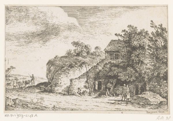 Curator: I am struck by the immediate textural contrast— the way the stark stone ruin sits amidst the softer foliage. Editor: That's a perfect segue to our featured artwork! This is "Vue du Tombeau de Virgile" - View of Virgil's Tomb - created in the 18th century by Adélaïde Allou. You can find it at the Metropolitan Museum of Art. Curator: Right. And looking closely, you see it’s not just a romantic ruin. Note the wear on the stonework. Consider how prints like this served as a visual record, almost a catalog, of the sites considered essential to the Grand Tour experience. It’s a very mediated way of encountering classical antiquity. Editor: Agreed. This looks like a print, a practical and reproducible medium—how many of these were made, passed around, affecting the collective memory of the real place, Virgil’s supposed tomb? What about the engraver, and the printing press and the paper? How did those affect the final product, the “view” itself? Curator: Absolutely, and look at the figures scattered throughout. They aren't interacting. Each inhabits its own space within the frame, seemingly disconnected from a shared experience. Almost like placing classical statuary in an artificial picturesque landscape for consumption. Editor: I also note how Allou’s handling of line work emphasizes the artificiality of the image. The etching feels more descriptive than emotional, flattening the sense of depth. The architecture has prominence over the softer textures of the natural environment Curator: I think that's precisely the point. The artwork highlights a period invested in classifying and possessing these landmarks through representation. Each impression is evidence of a social act, an aspiration, almost like an early form of travel documentation and accessible travel guides for affluent families. Editor: Very true. This isn't just an image of a place; it's about claiming that place and displaying it. A demonstration of refined taste and leisure afforded to the upper classes Curator: Yes, a printed artifact becomes a souvenir, legitimizing access to knowledge, and even acting as a badge of cultural sophistication, and all through these lines of ink, mass produced, for wide distribution. Editor: On my side, I come away considering this intersection of place, representation, labor, and accessibility - who is Virgil for, and who is this "tomb" for in the 18th century. Curator: And I leave feeling reflective about the institutional and social frameworks which shape the meaning of these places over time and across different media. Thank you.
