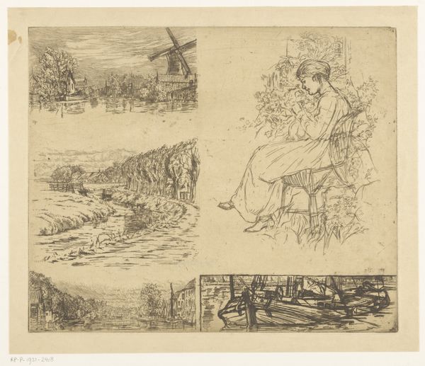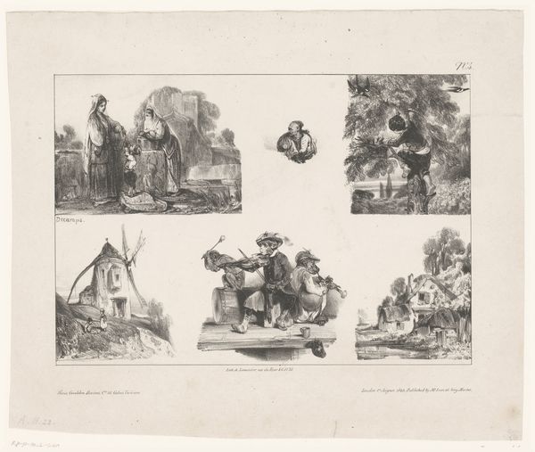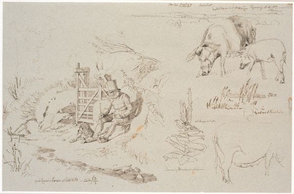 Curator: Firmin Gillot’s sketchbook page from 1864-1866 offers us a glimpse into his diverse interests and travels. What strikes you most about this sheet of studies? Editor: It feels melancholic. There is a vulnerability in its rawness that’s particularly appealing, each vignette telling a unique story but they all share a somber emotional tone. The desolation is powerful! Curator: Gillot utilizes ink on paper to present seemingly unrelated scenes, from portraits of women to landscapes and even scenes of battlefields with vultures picking at carcasses. It is this collage effect that highlights the interrelation between disparate social contexts. Editor: Absolutely! The juxtaposition is critical. Look at the tenderness of the mother and child right next to the landscape with vultures. This points to a cycle of life and death as one of continuous interplay. The juxtaposition makes one ask what each section may have in common? It emphasizes mortality. Curator: The historical context is crucial here. The sketches related to battle and struggle resonate with the widespread violence of the 19th century in Europe and colonial contexts. Gillot presents a history-painting reduced to only its fundamental essence: violence. But how do the portraits of women then fit into this larger picture? Editor: They remind us that, in the midst of these monumental, masculine, historical struggles, personal experiences still take place and that their importance is not negated by large-scale, global events. The mundane persists and contrasts the glorification of warfare by historicists and conservatives of the time. Curator: Indeed, these compositions explore multiple perspectives, merging the domestic sphere with broader conflicts and environmental devastation, while being constantly aware of the individuals impacted by it all. This sketchbook encapsulates Gillot’s nuanced perspective, acknowledging beauty alongside despair, to bring about social awareness. Editor: Precisely! These scattered vignettes underscore the interconnectedness of humanity—a shared fate regardless of social status or location. I love this sense of solidarity and intersection. The page creates an archive for memory.