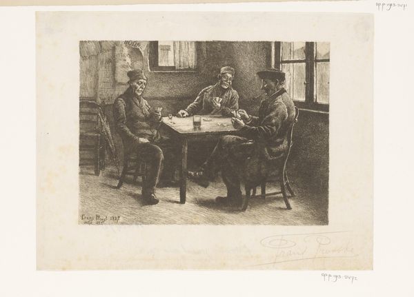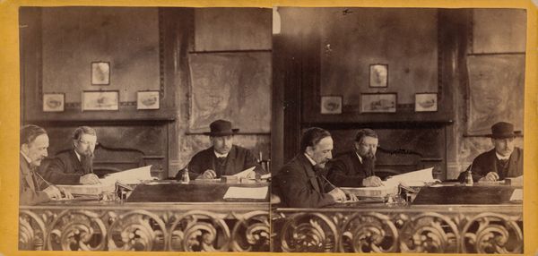 Curator: Joseph Jessurun de Mesquita captured this fascinating group portrait in 1886. The piece, entitled “Philippe Zilcken, Marius Bauer en Jan Veth bij de etsdrukker Martinus Mouton in Den Haag,” is a gelatin-silver print. Editor: The sepia tones lend a feeling of almost unbearable solemnity. I'm drawn to how all of the figures seem lost in thought, except for the one man staring directly into the lens. His eyes pull you in immediately. Curator: The setting of a printing shop is crucial. In focusing on the labor and camaraderie inherent in the artistic process, the photo destabilizes notions of the singular, genius artist, directing our attention to the collaborative social relations of artistic production in late 19th century Netherlands. Editor: Absolutely. The print shop becomes almost sacred, a modern temple of creativity, if you will. Note the repetition of circular forms: the hats, the heads, the chair backs, echoing the cyclical nature of printmaking itself. Curator: Yes, and consider how the clothing and pose signal certain power dynamics: those in bowlers occupy seats of power while the figure standing over them takes on a role as observer and helper. I wonder about class dynamics, too. Are those standing forced into positions of servitude to those sitting, as the figures literally loom over them? Editor: Perhaps. The bowler hat as a symbol of bourgeois stability is fascinating, even when cocked jauntily on the wearer’s head! It almost dares us to challenge the wearer’s authority. I see the window behind them, too. Does that signify progress and the movement of creative ideas? Curator: The window could certainly serve as a metaphor for societal visibility, especially since all members in the picture are men. The under-representation of women is a constant problem in arts at this historical period. Editor: This makes me want to dive more into symbolism in early photography as a way to access memory, collective and personal. Curator: For me, too. The power dynamics on display really invite interrogation as to the relationship between artistic production and wider cultural inequalities of that era. Editor: Such a fascinating print. Thank you for the insight.