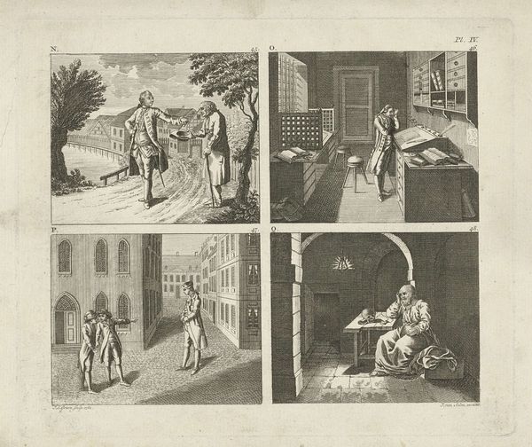Editor: This is "Fremstillinger for børn" by Johann Gottlieb Friedrich, created around 1790. It’s an engraving, or possibly an etching. It’s intriguing how these four scenes are laid out, almost like panels in a comic. What strikes me most is how each little narrative seems to carry such weight, especially given the medium. What do you see when you look at this print? Curator: For me, the compelling aspect here is the labour involved in creating such a detailed print. Consider the tools and processes: the metal plate, the acids, the precise hand movements required to incise these scenes. Each line, each shadow, is a result of deliberate, physical effort. How might this method of production influence our interpretation of the imagery? Editor: That’s a great point. Thinking about the labour makes me see the detail in a different way. It wasn’t just drawn, it was crafted, very deliberately. Does that process influence the storytelling here? Curator: Absolutely. The narrative is embedded in the material. The printmaking process made it accessible, replicable, for wider consumption by children, as the title suggests. We need to consider who would buy it and for what purpose, in 1790? Is it moral instruction, entertainment, or something else entirely? Also note the subtle class differences depicted in each panel – is there a critique embedded there? Editor: That’s fascinating. I was so focused on the imagery, I hadn't considered that. The method really does influence everything – even who gets to experience the art itself! It was designed for mass consumption by children! I initially didn't consider the wider social context of how people were accessing these images. Curator: Precisely. Thinking about materiality helps unlock a richer understanding of not just what we see, but how it was made and what it meant to its original audience. It underscores the link between artistic production, societal structures, and systems of labor and access.