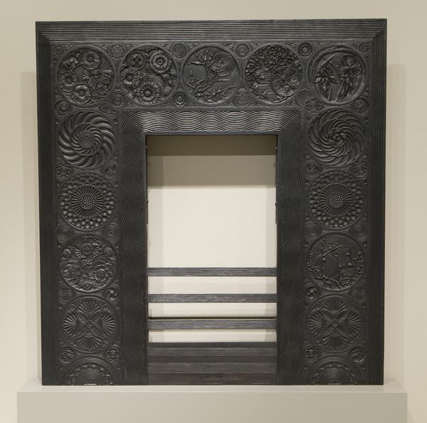 Jiménez Deredia's sculpture “Space and Nature” employs the stark contrast of industrial materials against organic motifs to explore themes of balance and tension. The piece is structured around a rigid, rectilinear frame, a grid of metal bars suggesting both containment and open space. Within this framework, Deredia suspends a vertical chain of diamond-shaped elements, each bearing an abstract, tree-like form. The geometric precision of the diamonds contrasts sharply with the fluid, asymmetrical lines of the arboreal designs, creating a visual dialogue between the manufactured and the natural. The composition is grounded by an organic vessel, its smoothed surface reflecting the light and shadows. Deredia destabilizes traditional notions of sculpture by integrating spatial dynamics and challenging the viewer to consider the interplay between form and content, rigidity and fluidity, structure and nature.
