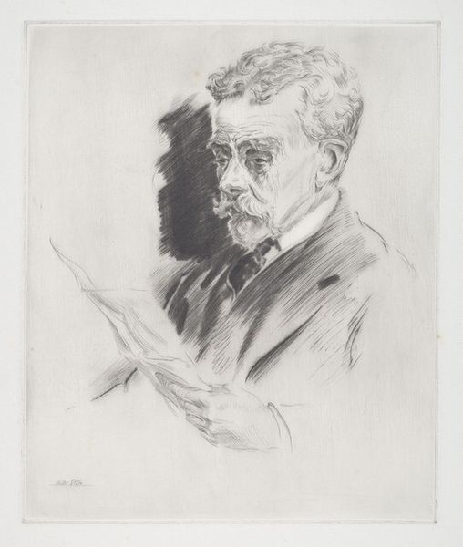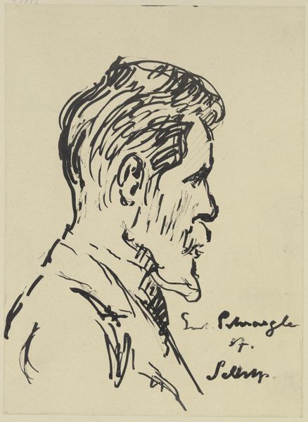 Editor: Here we have Willy Sluiter’s 1922 drawing, "Portret van E. Bonebakker," rendered in graphite. It's a very…direct portrait. The sharp, confident lines and slightly exaggerated features create an immediate sense of character. What strikes you most about its composition and technique? Curator: The efficiency of line is paramount. Observe how Sluiter captures the essence of Bonebakker with minimal strokes. Notice especially the dense hatching which defines the suit, starkly contrasting the lighter touch used on the face. It is this variance of mark-making that provides dimensionality. Editor: So, it’s the artist’s deliberate control of line weight and density that constructs both form and the impression of depth. But the subject’s face seems a little flat relative to the dark suit. Was it unfinished? Curator: Not necessarily. Focus, instead, on how that deliberate contrast manipulates our perception of depth. The flattening of the face pushes it forward visually, while the deep hatching of the suit recedes, enhancing the overall dynamism. Think about how Sluiter invites a dialogue between flatness and depth, rather than presenting a realistic likeness. Is it not an investigation of the surface of the paper itself? Editor: I see, it's not about realism. Now that you mention it, I'm curious how a different use of hatching in the face might impact how the viewers percieve depth and dimensionality in this image. Curator: Precisely. These visual strategies ultimately convey information. Through careful observation, we reveal Sluiter’s skillful understanding of line and tone. Editor: Thank you. I think looking at the artwork in terms of its technical strategies rather than subject helps clarify the artist’s intent.