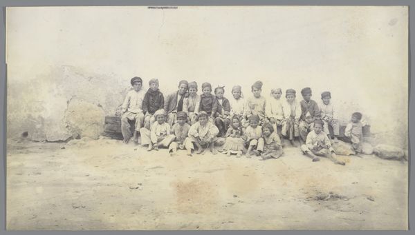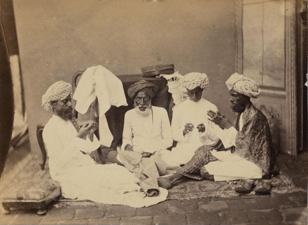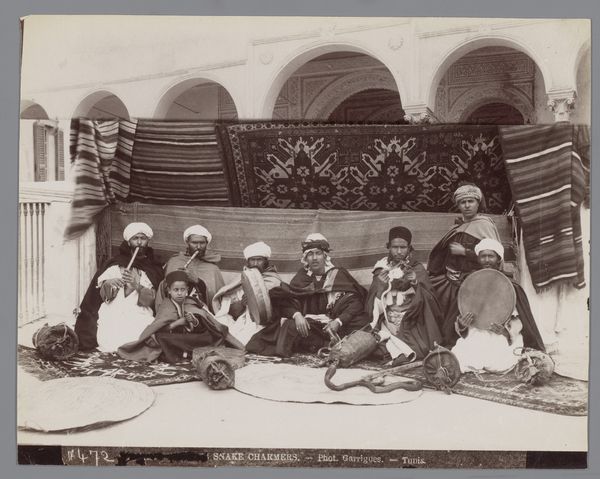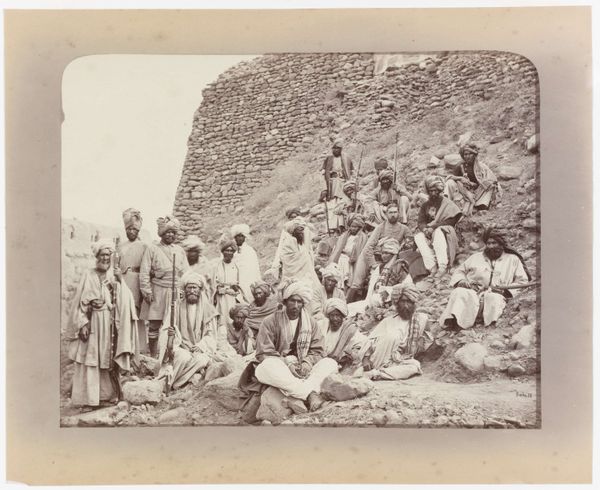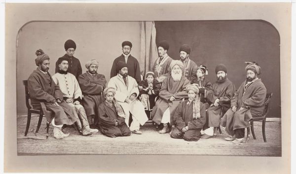 Curator: It feels quite imposing, doesn't it? All these men, looking directly at us. Editor: Indeed. We are looking at "Groepsportret van onbekende Afghaanse mannen," a group portrait of unknown Afghan men created by John Burke between 1878 and 1880. This gelatin silver print, dating from the late 19th century, gives us a glimpse into a specific moment and possibly the dynamics of colonial encounters. Curator: It strikes me as staged, almost like a tableau vivant designed to project a certain image to a Western audience. The turbans, the postures... the gaze. I wonder what power dynamics are at play. Who commissioned this and for what purpose? How did they conceptualize themselves in relation to those portrayed? Editor: The arrangement itself is rather pyramidal. Notice how the repeated triangular forms created by the white headwear create an almost floral, perhaps even crown-like motif. I suspect that the white headwear indicates high status among the figures shown here, conveying not just unity but also, perhaps, spiritual authority. The somber expression shared by each of these sitters creates a palpable solemnity and gravity in the work as well. Curator: That's a fascinating observation. It brings to mind Edward Said's concept of Orientalism. How images like this were often used to reinforce Western perceptions of the "Orient" as exotic, mysterious, and ultimately subordinate. We should be critical and recognize these works as instruments for controlling and maintaining hierarchical structures in the service of Western Colonial interests. Editor: I agree there are obvious overtones of "othering", yes. But the picture plane teems with complex, competing forces and gestures, all frozen in time. How might it complicate, or maybe undermine, Orientalist conventions? It is an aesthetic achievement as well that goes beyond social engineering: A snapshot imbued with its own haunting symbolic value. Each of their faces feels so individual despite the formality of the arrangement and headwear. Curator: It prompts important conversations about representation, power, and the ethics of visual culture, urging us to confront uncomfortable aspects of our shared history and envision new ways of engaging with such material. Editor: Yes, absolutely! By looking closer we hopefully teased out its layered cultural meanings for our listeners, recognizing that any image speaks through historical symbols in compelling ways, yet its full import only emerges through engaged questioning of those symbolic traditions.