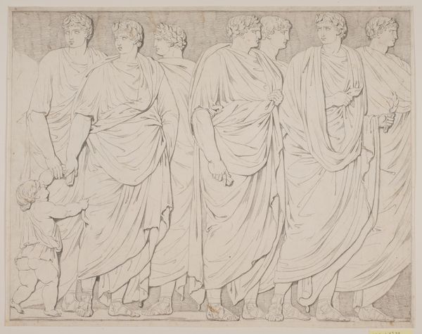 Curator: This drawing is entitled "Karyatidehallen på Erecteion" by Jan Jacob Schenkel, likely created sometime between 1829 and 1900. It’s currently held here at the Statens Museum for Kunst. Editor: My first impression is one of somber dignity. The sepia tones lend a weight of history, and the figures stand with a quiet grace. Curator: Indeed. This rendering shows the Caryatid Porch of the Erechtheion, a temple on the Acropolis in Athens dedicated to both Athena and Poseidon. Consider the labor, not just to create the original sculptures, but also to translate this architecture onto paper, each line carefully laid. Editor: The Caryatids themselves, acting as architectural support, are so much more than just columns. They become symbols of female strength and endurance. Each holds her head high, burdened yet regal. The wreaths and gestures – what do they evoke for you? Curator: Beyond symbolism, I see social commentary, too. Consider the accessibility of art historical studies at the time of this work's production. How did one acquire such skills of rendering classical subjects and architecture? Was Schenkel producing a souvenir, a study for a larger project, or some act of love and appreciation? Editor: It's interesting you mention love. To me, these women almost act as priestesses or guardians. It's about cultural memory, about invoking the spirit of the ancients. Each one becomes a vessel, carrying the weight of their civilization. Curator: I think, also, of the act of drawing, itself a kind of material meditation. Schenkel had to have deeply engaged with the forms, studying each fold of drapery, the subtle curve of the neck. It's not simply documentation; it's a form of physical interaction across centuries. Editor: It truly makes one consider the many interpretations contained in this relatively simple rendering. The enduring symbolism combined with the work it takes to bring that symbolism into a drawing form makes the art memorable. Curator: Yes, it's about both the enduring power of classical imagery and the material effort required to translate and transmit it.