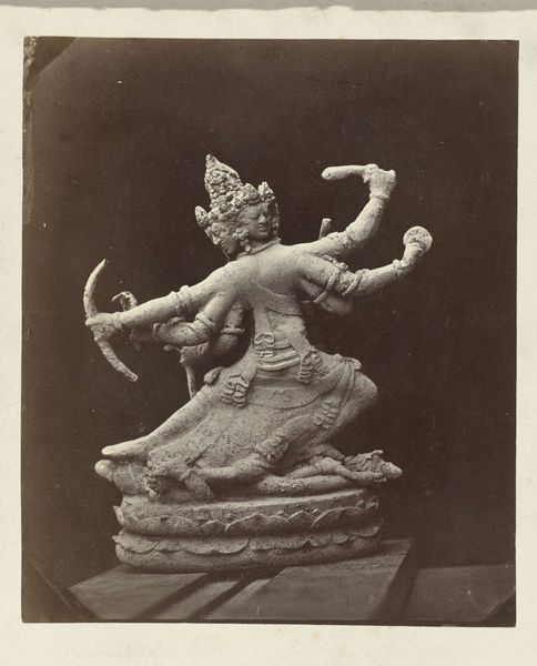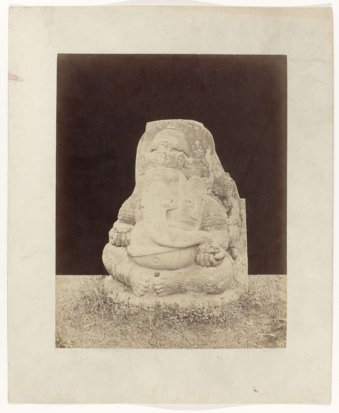 Curator: Looking at this fascinating carving, identified as “Rear View of Ganesha with the Face of a Monster” by Isidore Kinsbergen, and potentially dating from 1867-1868. What are your initial thoughts? Editor: My first impression is a kind of playful horror. It's intricately carved, clearly invoking religious symbolism, yet the grotesque mask and posture convey a strange ambivalence. Who are we meant to see in this divine-demonic portrait? Curator: Well, Ganesha, of course, represents wisdom and prosperity in the Hindu tradition, but monstrous faces aren’t uncommon within complex religious symbology. Consider the protective role monsters play, frightening away negative energies and asserting divine power through confronting what terrifies us. Editor: Absolutely, and I wonder about the cultural context that might be reflected in such work. A colonial gaze framing the divine through the lens of the monstrous? Does it performatively other, or challenge colonial definitions of otherness through re-claiming and resignifying it? Curator: The potential intention to reclaim and re-signify cultural identity, especially during the colonial era, is definitely worth noting. I am curious how this blend of fear and veneration, presented in a photograph, may function on the emotional subconscious of the colonizer and the colonized. Editor: And for viewers now. To what extent are we still struggling with colonial afterlives in how we read cultural artifacts? Even just using "monster" as a descriptor reinforces an outside, Western gaze. Curator: A Western interpretation undoubtedly colors the lens, yes. "Monster," perhaps more accurately representing a complex guardian or manifestation of powerful cosmic forces, also touches on enduring human preoccupations: How do we reconcile contrasting aspects of being? How does something so imposing bring wealth or wisdom? The figure holds power—destructive and creative, much like many deities across cultures. Editor: Thank you! Your reading reminds us that power doesn’t exist in one sphere; to consider its religious and historical context and challenge pre-conceived frameworks. Curator: It reveals the beauty in nuanced historical memory that resists definition.