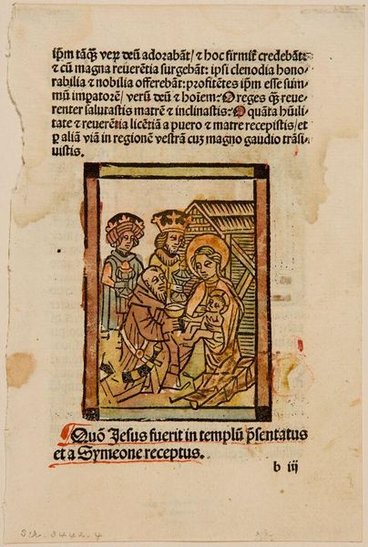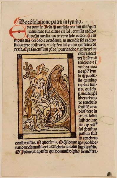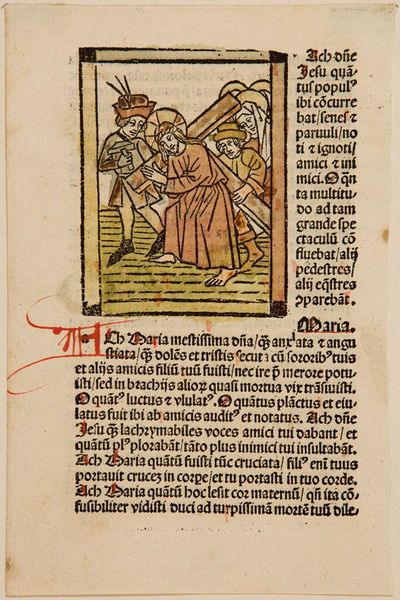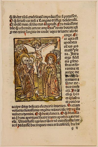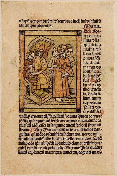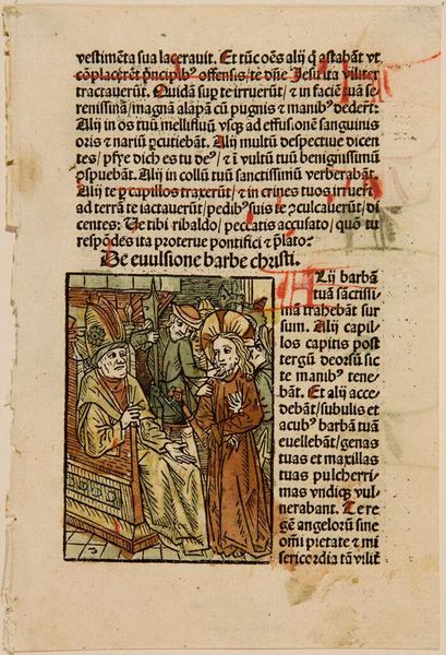 Editor: This is "Illustration XII," a fascinating, undated piece from an anonymous artist, currently residing at the Harvard Art Museums. It looks like ink on parchment. I'm immediately struck by its starkness. It almost feels like a scene unfolding on a stage. What do you see in this piece that I might be missing? Curator: The rawness is what grabs me! Think of it as a medieval comic book panel, vibrating with unfiltered emotion. The halos suggest sanctity, yet the figures are caught in a moment of brutal action, maybe even betrayal. The sword, the pushing... it’s all so visceral, don’t you think? The rigid text surrounding the image, and the simple style... do you think it amplifies the story's intensity? Editor: Definitely, the text adds a layer of somber context. It’s like the image and words are in conversation. Curator: Exactly! And that conversation isn't always comfortable. It asks us to grapple with faith, violence, and the very human capacity for both. What did you learn from viewing the piece? Editor: To look beyond the simplicity and consider the complex ideas being represented. Thanks for the insight!