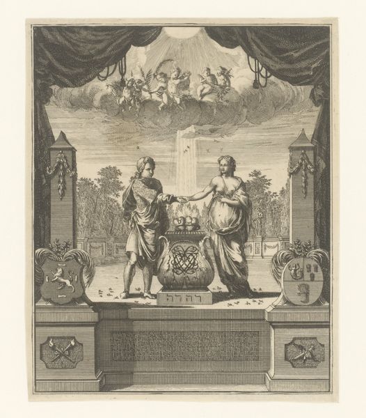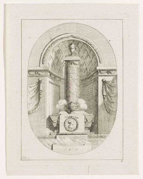 Curator: Antoine Maurin’s “Portret van Napoleon Bonaparte in een medaillon omringd door engelen en allegorische figuren,” created between 1805 and 1860, depicts Napoleon within an ornate circular frame. What strikes you immediately? Editor: The severity of line! It feels so deliberately constructed, every element precisely placed to convey a sense of idealized power. The contrast of the light and dark in the engraving only highlights that, creating a stark, almost unsettling visual. Curator: Absolutely. The work deploys potent symbolism to portray Napoleon. The angels holding the star allude to divine favor, reinforcing his authority, while the female figures embody virtues associated with his reign, almost as if Napoleon had been chosen by Destiny. Editor: Yes, those classical figures offer up these virtues but at what cost? We're asked to digest the rigid balance between them. This is classic Neoclassicism in that you get symmetry and crisp execution—with an interesting twist. It's visually making the argument for logic prevailing over emotion. It's essentially state propaganda visualized in monochrome! Curator: Agreed. Note how the eagle at the base anchors the medallion, further enhancing the message of strength and imperial dominance, tying into France's ambition to resemble the past Empires. What makes it history-painting if it never took place in history? Editor: Precisely. While the content is propagandistic, technically we see impeccable attention to the effects of chiaroscuro within a restrained palette of gray tones, achieving a remarkable range. These engravings were intended as state tools so attention to detail was part of that execution! Curator: Indeed. The artist invites the viewer to partake in a carefully cultivated image, intended to leave no doubt as to Napoleon’s position in history. It certainly makes you wonder about the weight images like these carry in shaping national consciousness. Editor: I see this print as a visual essay where Maurin methodically argues Napoleon's place through an intricate construction of idealized symbols. That rigor speaks volumes, almost above and beyond the actual symbolism involved. Curator: A compelling note on which to conclude! Thanks for joining me on this exploration. Editor: My pleasure! It's been enlightening to untangle the interplay of power and artistry.