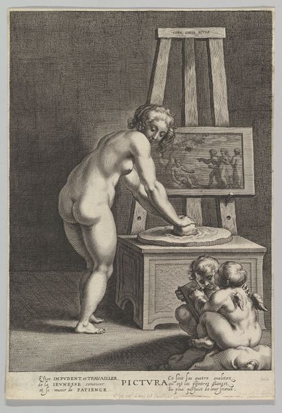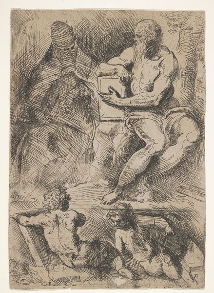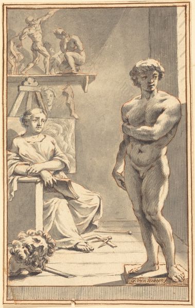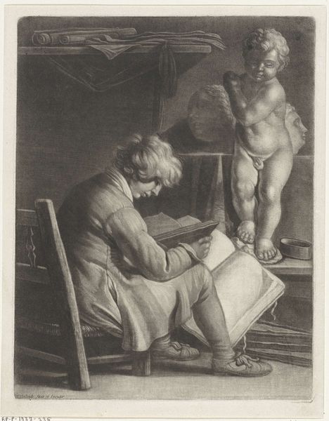 Wallerant Vaillant created this mezzotint, "Tekenende jongen," using a copper plate, a labor-intensive process involving numerous stages. The rough surface of the plate creates areas of tone by holding ink, which are then smoothed to produce lighter areas. Vaillant’s skill in manipulating the plate is evident in the print's rich tonal range, from the deep blacks of the background to the subtle grays defining the figure. The material itself—copper—demands a mastery that connects printmaking to other skilled trades, like metalworking. The image shows a drawing boy in his studio. The textures of the boy's turban and robe, the marble statues, and the paper of the books, all suggest a world of material refinement made accessible through Vaillant's meticulous labor. This print, therefore, is not just an image, but a testament to the cultural value placed on skilled handwork. It urges us to see how labor, material, and artistic vision converge.