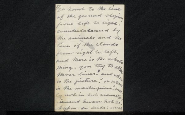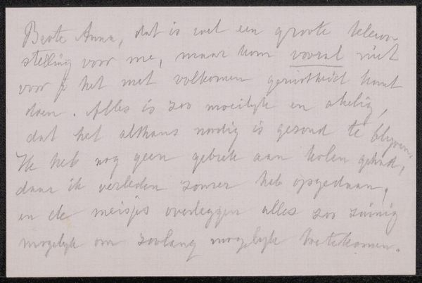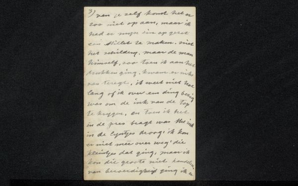Curator: This intriguing piece, “Gedicht uit collectie August Allebé," roughly translated as "Poem from the collection of August Allebé," dates from 1848 to 1927. Created by Allebé, this work uses ink on paper and showcases elegant calligraphy. Editor: It’s intimate, isn't it? The writing is so delicate and feels incredibly personal, almost like a secret message intercepted. It evokes feelings of longing or vulnerability, don't you think? Curator: Absolutely, and that sense of intimacy ties directly into Allebé’s artistic circle during that time. Examining the broader social canvas, his era saw burgeoning discussions around individual expression in the arts versus traditional artistic regulations. A deeply personal poem would resonate as a form of personal agency. Editor: Considering it is poetry, what I find really telling is how this poem itself can operate as a site of resistance to heteronormative poetic language that defined relationships, like in marriage; here, this could be positioned as a secret, personal affection to someone the poet addresses with the casual "Lieve Meid" – dear maid in English. It's compelling to imagine that subtext, knowing about contemporary constraints, like we see also today. Curator: That’s a sharp interpretation. Thinking about Allebé's wider oeuvre and historical setting of growing visibility of feminist issues adds weight to this reading. The understated composition, the choice of accessible materials like paper and ink, they all amplify the message's raw emotionality. The politics of art become strikingly personal. Editor: It makes you wonder about the addressee, doesn’t it? Considering historical roles, were there many female figures or feminist activists? What position in her family did this person have, who received these kinds of secret messages? Curator: Exactly. And such questions highlight the significance of works like this. By revealing traces of private thoughts and social conditions of its day, it compels us to remember our public and ethical responsibilities when viewing it today. Editor: Looking at this inscription now, what stands out to me is how Allebé created something tender yet powerfully charged. Curator: A potent example of art acting as both a mirror to society and a catalyst for change.