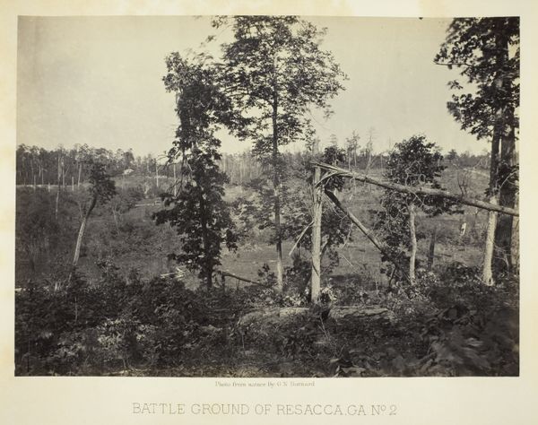 Editor: Here we have George N. Barnard's gelatin-silver print, "Battle Ground of Resacca, GA, No. 1," created in 1866. The bleak landscape really emphasizes the devastation, especially in the contrast between the rough ground and the bare trees. What can you tell me about how its materiality informs its meaning? Curator: Absolutely. Looking through a materialist lens, we should consider not only the scene depicted, but also the choices made in its production. Barnard chose photography, specifically the then-new gelatin-silver process. Why use a relatively "objective" medium like photography to document this scene instead of, say, painting? Editor: Maybe it was about immediacy, capturing the scene as quickly and accurately as possible for documentation purposes. Curator: Precisely. Photography here serves a function beyond aesthetics; it's about producing a record. And what about the availability and distribution of these prints? Who was meant to see these images, and what effect do you think that had? Editor: Well, these prints could be reproduced and disseminated widely. Perhaps they served to bring the reality of war—its cost—home to those far removed from the battlefields, prompting reflection on the industrialization and reach of conflict. It shows how materials can affect labor and accessibility in an era of violence. Curator: Exactly. By focusing on the materiality—the photographic process and its potential for mass production—we can uncover its societal influence, as well as question whose narrative is highlighted through the work. It's not just a landscape, but a calculated construction of memory and perception. Editor: I hadn't thought about it in terms of the choice of material reflecting that wider access to photographic material for reportage. Curator: A new and accessible format helps show us the scope of material devastation of war in a visceral and objective medium.