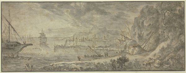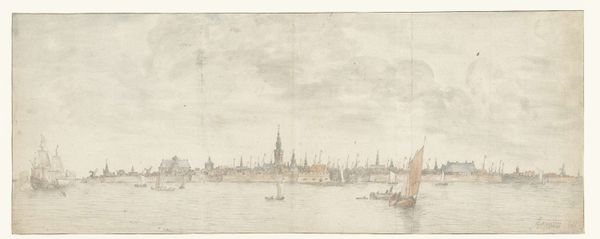 Editor: Here we have "Seehafen mit vielen Schiffen belebt" by A. van Beerestraaten, rendered in ink and graphite. There's such incredible detail despite the monochromatic palette. What strikes you about the composition? Curator: The interplay between the line and tone is what initially captures my attention. Observe how Beerestraaten manipulates graphite to create a sense of atmospheric perspective, the city dissolving subtly into the horizon. This evokes a profound question about what an artist defines as “finished”. What exactly are the limits of representation? Editor: So it's the considered *absence* of detail that you find interesting? Curator: Precisely. Notice also the stark contrast between the detailed foreground, and its formal relationship with the smooth rendering in the sky; consider the implied symmetry achieved by the two major clusters of human construction along the central horizon. One is invited to question what these choices can tell us about how Beerestraaten understood art to represent experience. The materiality serves this theoretical intention through formal strategies, would you agree? Editor: I think so, it gives depth...I see how Beerestraaten’s strategic compositional choices enhance the formal interpretation of the work. It goes beyond just documentation; it becomes a reflection on visual experience. I suppose it reveals how technique amplifies the artwork. Curator: Precisely. A successful inquiry, indeed.