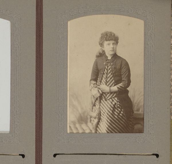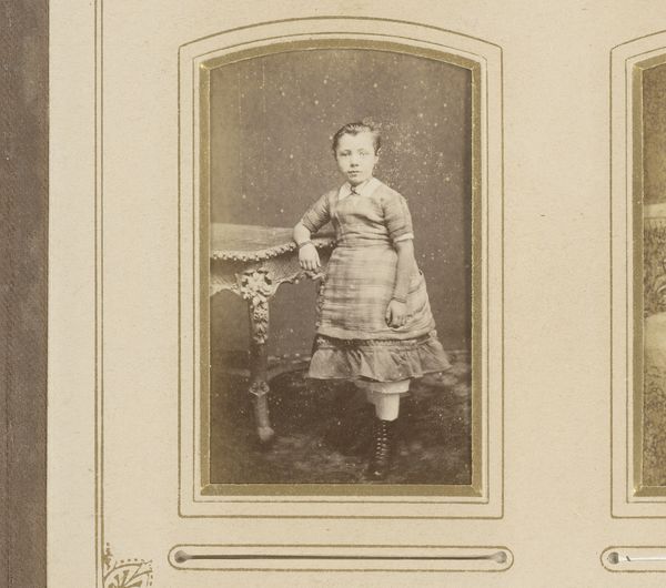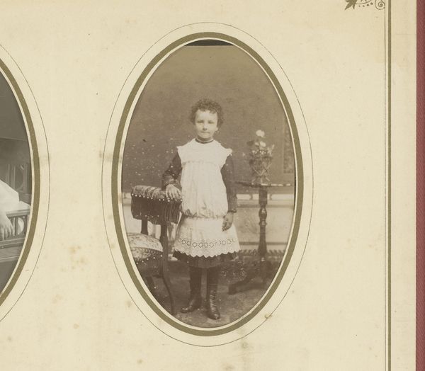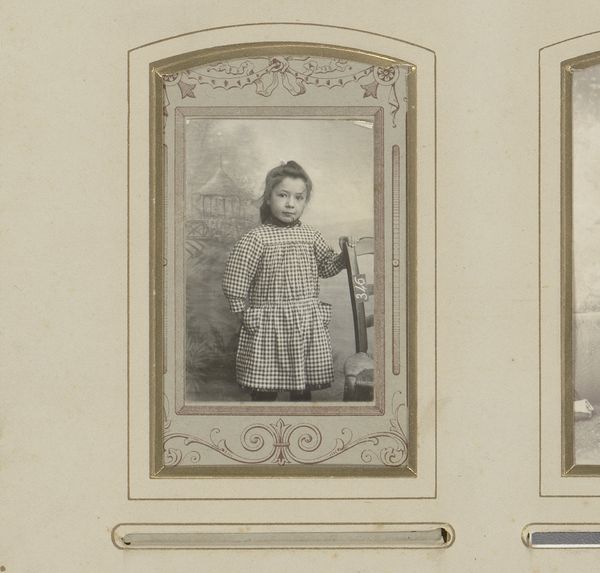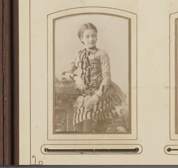 Curator: Here we have a photographic portrait of a girl standing beside a chair, with her foot resting on a tree trunk. The work is simply titled "Portret van een meisje staand bij een stoel met een voet op een boomstam", by Jacques Chits, created sometime between 1882 and 1894. Editor: Immediately, what strikes me is the girl's expression, so self-possessed. Her attire, that distinctive plaid fabric of her dress and the intricate lace collar, speak of a particular social standing, of materials consciously selected. Curator: Indeed. Contextually, the rise of photography during this period afforded a new way for families, particularly those of means, to document their children's growth and social status. These portraits, beyond simple documentation, performed a social function, signaling class and aspiration. Consider the carefully staged setting, too. It’s meant to project an image of gentility, though the raw material is carefully obscured. Editor: Exactly! The construction of that backdrop, meant to mimic nature—the way the fabric of that manufactured nature contrasts against the girl’s stance on a real-looking tree trunk makes a striking claim about access to labor, material, nature, even. It reminds us of photography's materiality too. The way light interacts with the chemical processes to fix the image, making the final photographic print. Curator: Looking at it from a feminist theory lens, we could consider this as part of the larger phenomenon of representing young women at the time. The image constructs an ideal of bourgeois femininity – emphasizing decorum and perhaps constraining the very subject it intends to capture. Note the pose too: foot on the log but hands still controlled, one clutching a small piece of white cloth, both indicators of prescribed female passivity even amid a relatively 'natural' setting. Editor: The materials themselves—the paper stock of the photograph, the dyes used to achieve its sepia tones, even the likely photographer’s studio with all the associated costs like wages, upkeep, supplies and taxes are material things that are woven together to produce a representation like this one. Every choice involved reflects value. Curator: These portraits served as signifiers of class and markers in a society navigating evolving gender roles and expectations. To decode it allows insight into the era's values and norms. Editor: Looking closer at this, one begins to think more expansively about how something as everyday-seeming as a photographic portrait implicates both the sitter and those around her, bound up within networks of exchange and human toil.