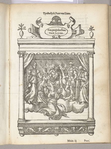 This engraving, titled "Vertoning van De Lisbloem (Mechelen)," dates back to 1561 and is by an unknown artist. The composition is striking for its balanced yet dynamic arrangement. The scene is framed by architectural elements with figures arranged in a shallow, stage-like space. Note the symmetrical placement of the columns and the arch above, contrasted by the asymmetry within the central scene. On the left, we see an angel figure holding scales, balanced by a seated, bearded man on the right with the kneeling figure beneath the female figure. Each element, from the scales to the floral staff held by the female figure, acts as a sign. What cultural codes can we discern? The scales represent justice, while the flowers could symbolize prosperity or civic pride. The kneeling figure and the dog seem to signal loyalty or submission. The engraving invites us to question the relationship between justice, civic authority, and moral submission. Its enduring power lies in how it prompts ongoing interpretation.