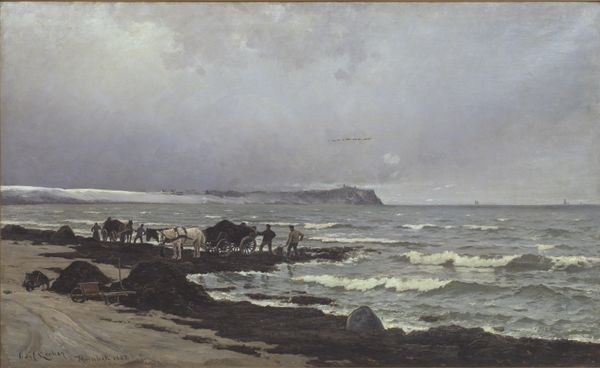 Curator: Thomas Doughty painted this evocative scene, titled "Coming Squall (Nahant Beach with a Summer Shower)," in 1835. Editor: The drama is palpable! The looming clouds create such a weighty atmosphere. One can almost smell the impending rain. Curator: Doughty, a key figure in the Hudson River School, excelled at capturing the sublime beauty of the American landscape. He's clearly using oil on canvas here to its full potential, in order to create a study on contrasting elements such as light and dark, stillness and motion. Editor: Absolutely, and I see a commentary on human vulnerability within this natural theater. The solitary sailboat, threatened by the squall, is quite emblematic of our precarious relationship with the environment, wouldn't you agree? Considering Doughty's historical context, are we possibly seeing allusions to the challenges facing the burgeoning American identity during a time of economic shifts and social uncertainty? Curator: It’s compelling to consider such interpretations. From a purely compositional point of view, notice how Doughty uses a fairly subdued palette dominated by grays and browns that give way to dynamic vertical movement with diagonal storming, suggesting at the romantic expression. Editor: Right, and this dynamic contrasts sharply with the almost surreal serenity depicted in the distance, thereby illustrating that the coming storm will create social or emotional chaos. Also, the scattered presence of avian wildlife in the backdrop suggests, too, the vulnerability of those most sensitive to societal disturbance. Curator: Such powerful dynamism creates an unsettling, though perhaps beautiful, image that reminds us of the precariousness of things. Editor: Yes, the painting becomes less a scene to gaze at but, rather, an urgent, timeless message regarding human survival amidst constant and imminent societal changes.