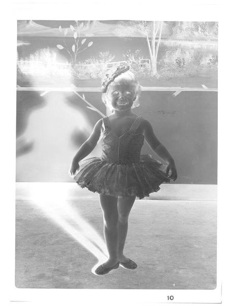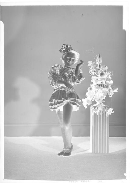 Editor: This is an untitled photograph by John Deusing, showing a young girl holding a baton. The high contrast gives it an otherworldly feeling. What can you tell me about the cultural context of images like this? Curator: It reminds me of images used in child beauty pageants. How do such events shape ideals of femininity and performance? Editor: That’s a great point. I didn’t think about the performative aspect of it before. Curator: Photography played a crucial role in both documenting and promoting these ideals. Do you think the negative format amplifies or diminishes the girl’s agency? Editor: Interesting! I think it diminishes it, making her seem more like an object than a subject. Curator: Right, and considering the time, these images often reinforced existing social hierarchies. The presentation mattered, as it still does today. Editor: That’s fascinating; seeing it through that historical lens makes it much more powerful.