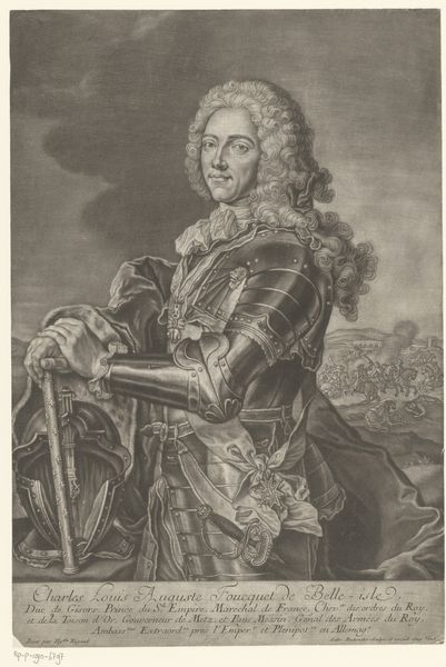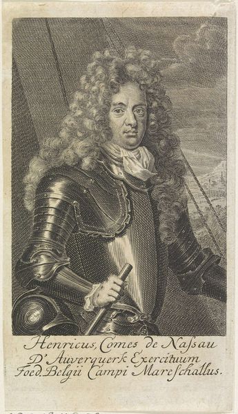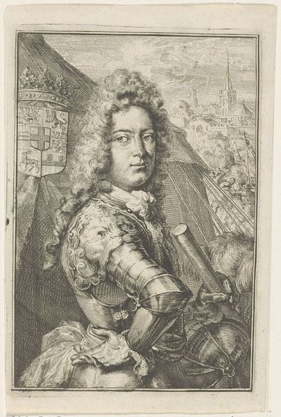 This is Arnold van Westerhout’s portrait of a man, possibly Ferdinando II de' Medici, made using etching. The artwork displays a symmetrical arrangement which provides a sense of balance. The subject, positioned centrally, commands attention through his ornate attire and confident gaze. Note how the intricate details of his wig and armor contrast with the softer background, creating a textured surface. Here, Westerhout challenges the traditional portrait. He is using etching as a medium to convey the sitter's status, so it allows for fine lines and tonal gradations. The composition invites viewers to consider the tension between artistic representation, social identity, and historical context. Consider how Westerhout's etching technique contributes to the overall effect, blurring the lines between historical record and artistic interpretation. As you leave this artwork, reflect on how the interplay of form, medium, and content encourages us to question established notions.