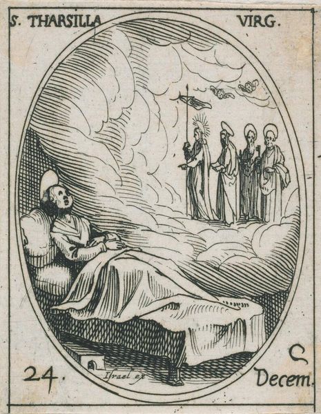 Editor: Here we have Jacques Callot's "Virgin in the Clouds," a small etching. It’s incredibly detailed for its size! What strikes me is the contrast between the heavenly scene and the earthly city. How do you interpret this work? Curator: The etching process itself is key here. Callot's skill in manipulating the copper plate allowed for mass production of this imagery. Consider the social context: How does this accessible format influence the dissemination and consumption of religious ideas? Editor: That's fascinating! I hadn't thought about the means of production impacting its reach. Curator: Precisely! The materiality informs its cultural impact. Editor: I see. So, it's not just about the image, but how it was made and distributed? Curator: Exactly. It makes you question what constitutes 'high art' when labor and accessibility come into play. Editor: I never considered it that way before! Thanks!