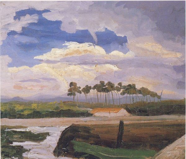 Editor: Here we have Churchill’s “View at Mimizan,” an oil painting. The artist’s application of paint captures this tranquil, watery landscape. It’s fascinating how he plays with reflection, light, and dark, but what stylistic elements stand out to you? Curator: The composition intrigues me. Notice the prominent horizontal division, almost bisecting the picture plane between the sky/water and the dark treeline. This division creates a spatial tension. Further, the painting showcases what we may call chromatic intensity. Would you agree? Editor: Yes, especially in the contrast between the cool blues and greens of the water and the richer, darker greens of the trees on the horizon. But is this division visually harmonious? Curator: Harmonious, perhaps, is not the operative term here. The formal tension lies in the near-perfect symmetry, were it not interrupted by those strokes of, shall we say, unrestrained color in the landscape itself? It beckons a query: how do these contrasting approaches inform our understanding of the piece? Editor: I see. So it's not just about capturing a pretty scene, but more about exploring formal relationships and tensions *within* the painting itself? Curator: Precisely. Observe, too, the textured brushwork; the materiality itself contributes meaning, resisting any simple mimetic function. Does that strike you as purposeful? Editor: It does. The painting then becomes less about what is depicted, and more about *how* it is depicted, and what effects those choices have. Thanks. Curator: A fitting summation. I'd suggest further investigation into Churchill’s unique brushwork that departs from the mimetic function towards evocative aesthetic expressions.