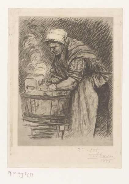 Auguste Danse created this print of a woman by a washtub using etching. At first glance, the composition seems simple: a figure positioned slightly off-center, bent over a large tub. But it’s the meticulous use of line that really defines this work. Notice how the density of etched lines varies across the image. In areas like the woman’s face and the folds of her clothing, the lines are closely packed, creating a sense of depth and shadow. In contrast, the background is suggested with far fewer lines, pushing it back and emphasizing the subject. The tub itself is rendered with a remarkable attention to texture; you can almost feel the rough-hewn wood. Danse’s print invites us to consider the relationship between labor and representation. How does the artist use line and form to elevate this everyday scene, and what does it tell us about the values and perspectives of the time? It’s a question that continues to evolve with each viewing.