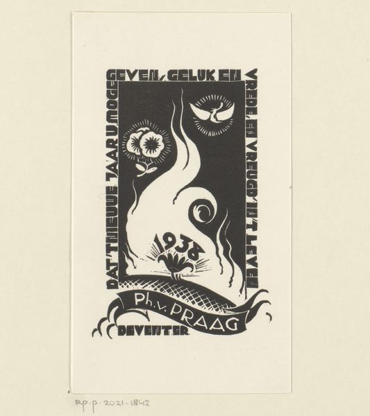 Editor: This is a bookplate, or "Ex Libris," from 1914 by Lodewijk Schelfhout, made using engraving techniques. I'm immediately drawn to its somewhat severe and almost mystical quality – the stark black and white and the stern-looking portrait in the center. How do you interpret this work? Curator: This bookplate resonates with the anxieties and burgeoning modern identities of the early 20th century. Notice the portrait, likely of Lodewijk Schelfhout. It’s framed within a stylized, almost halo-like circle. Who was included and excluded from representation? Do you see a parallel to the political climates emerging during the interwar period? How might we contextualize this visual rhetoric within the larger cultural landscape? Editor: The rigid geometry does feel at odds with the organic lines of his hair and beard, now that you mention it. I hadn't really thought about the halo as making a statement on class, but it could imply something about self-importance and representation, even in a personal object like a bookplate. Curator: Precisely. And consider that this is a bookplate. Book ownership was a marker of status and access to knowledge. How does this object, therefore, participate in larger power structures? What statements is the artist making about the accessibility and propagation of art and the knowledge within it? Does it invite dialogue with the viewer? Editor: It’s fascinating to consider it beyond just a decorative object, and more as a statement of identity and access. It really does invite more questions than answers. Curator: And those questions, born from careful observation and critical thinking, are exactly what bring historical works into the present. There are no definite answers; it's about the questions we ask!