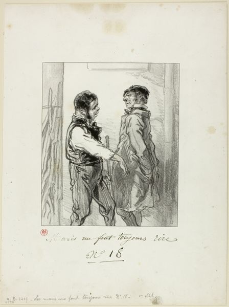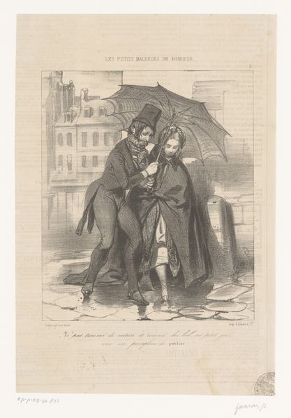 Editor: So, this is *Man en Vrouw in Modieuze Kostuums Maken Ruzie* - "Man and Woman in Fashionable Outfits Arguing," from 1841, by Paul Gavarni, it’s a pen drawing. It feels like we’re eavesdropping on a private moment, yet it’s all meticulously posed; a tiny window into someone’s life a couple of centuries ago. What jumps out at you? Curator: It’s a charged image, isn’t it? Makes you wonder what they're saying. And those figures looming in the background, do you get the sense they might be characters in a play? To me, this captures the feeling of societal tensions bubbling up beneath the surface. There's a darkness present that Romanticism was so good at portraying. The way Gavarni uses the pen creates a sense of immediacy. Are you getting that feeling of urban drama? Editor: Definitely getting that! It's interesting how the detail is focused on the foreground figures while the background blurs. Makes the argument seem more significant, almost isolated, even though they're in a public space. Curator: Exactly! It isolates and amplifies. Perhaps he's saying arguments, even small ones, have that kind of effect on those experiencing them. The world recedes. Have you noticed that little glimpse of humour there too? The grand gestures, the stylish costumes. Does it make it feel overblown? Editor: I see what you mean, like they’re performing. That definitely adds another layer. It is also fascinating the level of detail he achieves using such a basic material. Curator: Yes, it all feels like an exploration of the theatrics we all participate in. A scene from a lost play we were never meant to see. It captures something essential about us, doesn’t it? Editor: Absolutely! It’s made me think about the public and private aspects of conflict in a whole new way. Curator: Me too! I hadn't quite appreciated how cleverly it used drama and the snapshot feel to amplify those moments of disconnection. Thanks for the perspective.
