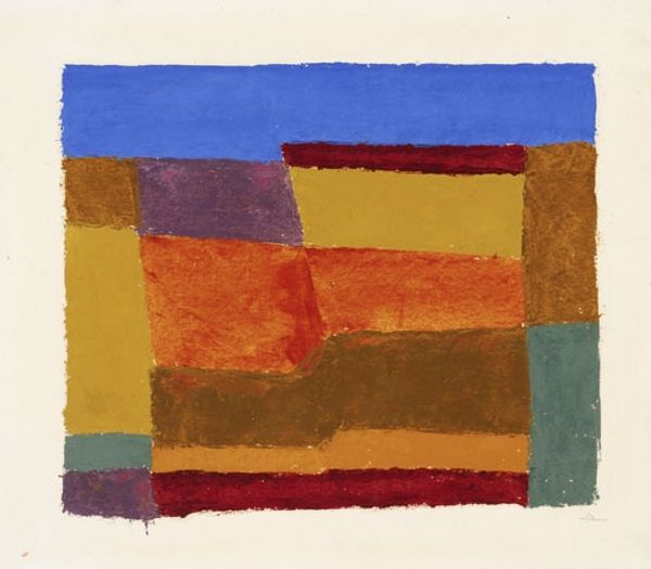 Editor: Carol Summers's "Rainbow," printed in 1958, immediately strikes me as deceptively simple. It’s a print with bold geometric forms but evokes a dreamlike landscape. How do you interpret this work and its relationship to its time? Curator: I see this piece as a product of its historical moment and as a commentary on abstraction’s accessibility. The late 50s saw rising tensions around identity and conformity, a sharp contrast to the playful abstraction presented here. How might this work engage with the period's political anxieties, even as it seems purely aesthetic? Editor: So, beyond the surface appeal, is there an argument for "Rainbow" subtly critiquing social conformity? The simple shapes versus complicated meaning? Curator: Precisely! We might also consider the implications of making art more accessible. In what ways could this print, with its almost childlike forms, represent a democratic impulse, pushing back against the perceived elitism of the art world at the time? Could it represent the common person's rainbow? Editor: I didn’t think about it like that. I suppose seeing a rainbow carries cultural weight as it relates to civil rights, too? Curator: Absolutely. And it serves as a potent symbol within contemporary discourses on identity, community, and diversity, as its many-colored variations have long acted as affirmations of difference and togetherness. How fascinating that a print from 1958 anticipates this reading. Editor: This has definitely opened my eyes to layers of meaning I hadn't considered before. Curator: Me too! I find the relationship between apparent abstraction and socio-political meaning in art always a complex yet productive avenue for interpretation.