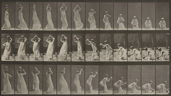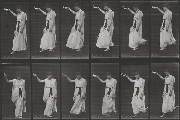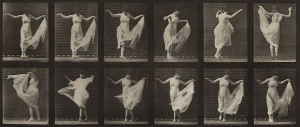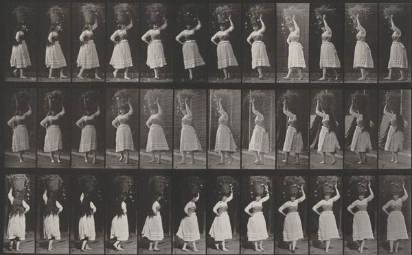 Eadweard Muybridge created this photographic plate, “Dancing (fancy),” to capture movement through a sequence of still images. The composition is arranged in a grid, a series of frames, each freezing a moment of a dancer’s motion. The sepia tones and stark lighting give a clinical feel, emphasizing the scientific nature of Muybridge’s project. The dancer is a subject reduced to component parts, where Muybridge seeks to understand the mechanics of motion by breaking down the continuous flow into discrete units. The grid format is reminiscent of early time-and-motion studies, influenced by emerging ideas about efficiency and standardization. Each frame functions as a signifier, collectively constructing a narrative. The semiotic structure of the grid layout invites the viewer to analyze the gesture’s progression. This arrangement challenges the static nature of traditional photography, instead inviting a reading of movement through space and time. This destabilization of fixed representation is key. The artwork's function becomes a question of categorization. Is it art or science? It reflects a broader intellectual shift towards understanding the world through systems.