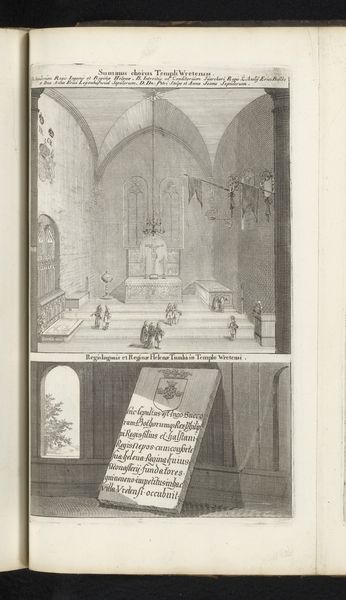 Editor: This engraving, created in 1693 by Willem Swidde, is titled "Chapel and gravestone of Sune Sik (Sverkersson) in the Vreta Kloster Church." It looks rather austere. The strong lines and architectural focus create a very formal, almost cold, impression. What strikes you when you look at this work? Curator: What immediately compels me is the piece's compositional dichotomy. We observe a stark division of space, vertically bisected into two distinct yet related perspectives of the same subject. Let us examine the upper register: The interior rendering exhibits a rigorous application of perspective, converging to a vanishing point that reinforces the sacral essence of the chapel. The artist skillfully articulates the architectural anatomy through meticulous lines, delineating the vaulted ceiling and the subtle gradations of light and shadow. Editor: So you’re saying that even in the engraving, there's a clear focus on using light and lines to create depth and a sense of the sacred? Curator: Precisely. Now, consider the lower register. The perspective shifts to foreground the gravestone, effectively isolating it within a liminal space between the interior and the external environment. Note the contrast between the solid, geometric form of the stone and the suggestive presence of the architectural structure visible through the implied doorway. This layering of spaces… Editor: Almost creates a tension? A dialogue between what’s inside and what’s outside the chapel? Curator: Indeed. It prompts inquiry into how space is constructed and how the elements interplay, as a kind of dialogue that defines the structure’s symbolic function and visual interest. Editor: That’s fascinating. I hadn’t considered the separation and layering, and the way the artist used these architectural components, creating a strong visual, not only in the individual panel but also within the diptych. Curator: Such consideration enriches our reading of the visual object, expanding possibilities beyond its apparent subject matter.