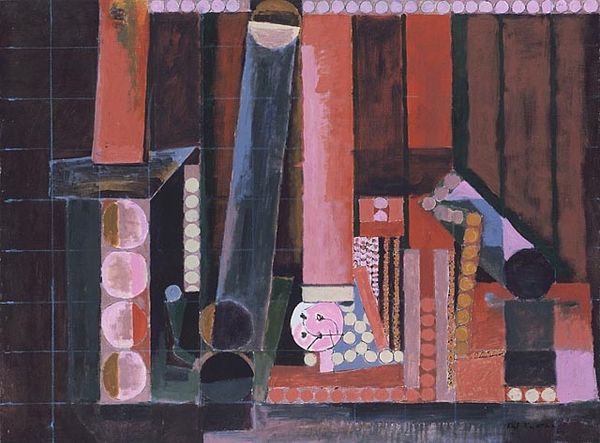 Willi Baumeister made this print, Red Frieze, and though we don’t have a specific date, it’s from the middle of the last century. It’s a lithograph, which is a type of printmaking, so the textures are very flat and the colors are consistent across the surface. The shapes remind me of Miro, but the way they are organized makes me think of architecture. The dark trapezoid near the top looks like a building casting a shadow, and the olive-colored sticks look like scaffolding. But it is also like a little theater with all these characters that are just shapes. The shapes are more or less contained within the red field, but near the top and bottom edges there’s this beige color peeking out like a frame within a frame. It gives the feeling that the image is a fragment of something larger that we can’t quite see. In that sense, this piece reminds me of Leger, particularly his interest in machine forms and the interplay between abstraction and representation. What could these shapes represent? It’s a question with infinite possibilities.