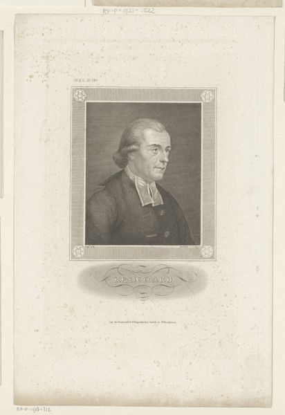Editor: This is a print titled "Portret van O. C. Wolterbeek," created sometime between 1828 and 1843 by Jan Lodewijk Jonxis. It looks like an engraving, a medium I don't often see portraits rendered in. It definitely has a formal and perhaps even stern quality. How do you interpret this work, especially considering its historical context? Curator: The "stern" quality, as you say, might reflect the sitter’s social positioning. The Reverend Wolterbeek was likely a man of significant influence within his community. The portrait, and its distribution through print, serves not just as a likeness, but as a statement of power and authority. Who had access to portraiture like this, and what did that signify? What visual cues suggest this social hierarchy to you? Editor: I suppose the wig and formal attire speak to status, maybe education as well? Were printed portraits common for disseminating information about influential figures? Curator: Exactly. This print circulated within a specific social sphere, reinforcing existing power structures. The meticulous detail achieved through engraving conveys a sense of realism, which in turn legitimizes Wolterbeek's position. How does this contrast with more contemporary forms of portraiture and representation? Think about who gets represented now, and by whom. Editor: Today, photography and digital art offer broader access to portraiture, often challenging traditional power dynamics by focusing on marginalized communities. Here, Wolterbeek's gaze seems to assert dominance, while modern portraiture often seeks to empower the subject. Curator: Precisely. And what does that say about societal shifts in how we view leadership and representation? Consider also the role of institutions like the Rijksmuseum in displaying such images – are they reinforcing or challenging historical narratives? Editor: I hadn't considered the museum's role that way, but it is really something to think about. Thanks, that perspective really helps me contextualize this piece. Curator: Absolutely! These historical images have reverberating effects on modern cultural ideas about leadership and recognition.