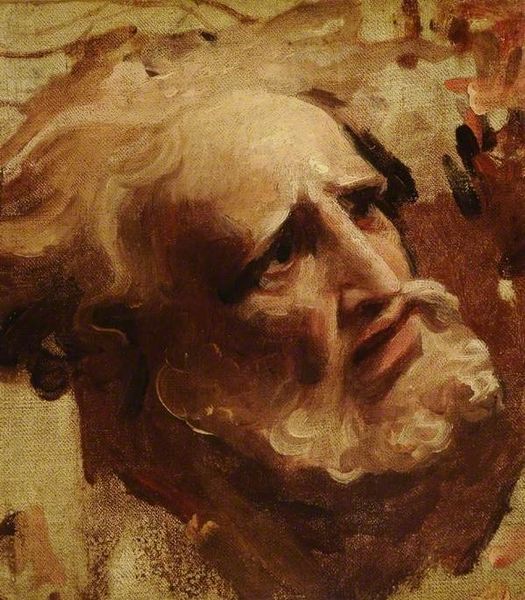 George Romney rendered this Head of an Apostle with oils on canvas. Immediately, the rough, expressive brushwork catches your eye, forming a dense web of ochre, red and umber tones. This almost tactile surface gives the face an immediacy, as though emerging from the very depths of the material. Romney uses the interplay of light and shadow to model the apostle’s face. Note how the light rakes across the forehead and cheek, emphasizing the sharp angles and deep-set eyes. The apostle’s gaze, directed upwards, and mouth slightly ajar, suggest a moment of revelation or perhaps anguish. This emphasis on emotional intensity relates to the broader Romantic movement, which valued subjective experience and individual expression. Romney’s focus on capturing the fleeting moment, the raw emotion, transcends mere religious iconography, inviting viewers to contemplate universal themes of faith and human existence. It's in this dance of light, color, and form that Romney invites us to reflect on the transient and enduring aspects of the human condition.