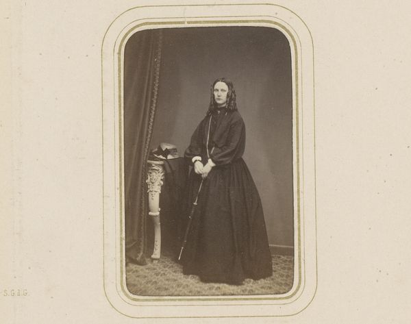 Curator: What a wonderfully stern image. "Portret van een vrouw, staand bij een tafel met een hand op een open boek"—"Portrait of a woman, standing at a table with a hand on an open book." This photographic work, captured sometime between 1860 and 1900 by O.C. Smith, gives us such a glimpse into the rigid presentation of women during this era. Editor: My goodness, that's quite a mouthful for a title. For me, right away, I'm struck by the monochrome palette. It really dials up this solemn, almost theatrical atmosphere, you know? She looks a bit… haunted? Curator: The limitations of early photographic processes certainly contributed to the somber tone. But let’s also think about the socio-political implications: her attire, that modest dress and pearl necklace, suggests a woman of a certain class, abiding by restrictive societal norms. Editor: I see what you mean! The pearl necklace reminds me of a noose, though probably unintentionally, considering she's posing next to a book. And she could almost be about to start reciting Shakespeare with all of that gravitas. Curator: It could represent status. The book, I think, symbolizes learning, access to knowledge, however the woman’s pose and gaze are rather unsmiling. What’s fascinating is how women historically have had their access to literature and information mediated by gendered power structures. This book becomes both an object of intellect and one potentially indicative of enforced submission, even indoctrination. Editor: Absolutely, it almost seems performative! Though there's this teeny rebellion gleaming in her eyes that I can't help noticing. And honestly, it would be so easy to recast this portrait in a punk music video—tear the pages from that antiquated book. Curator: Right. Reimagining her defiance gives us an important point. Considering what was demanded of 19th century women and understanding today's battles for true liberation gives it renewed poignancy. The photo gives such a complex snapshot into an uneasy existence! Editor: Yes, it makes you think of what has changed, but mostly, what hasn't. The old-timey photograph almost holds a contemporary mirror to the soul, or…at least pokes the third eye. A worthy, melancholic conversation piece!