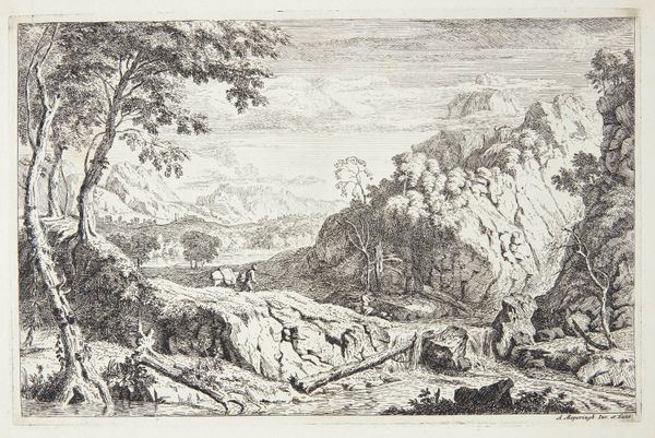 Editor: We're looking at Jean-Baptiste-Claude Chatelain's "Landscape," etched sometime between 1725 and 1763. The level of detail in this print is incredible, and somehow evokes a feeling of both serenity and bustling life. What strikes you most about it? Curator: The lines, for starters, they sing! Like looking through a memory, isn't it? Faded, familiar... I’m drawn to how Chatelain uses light and shadow to create depth – the eye travels into the scene almost effortlessly. The etching has the effect of a whispered invitation to walk into another time. Have you considered the placement of the figures? Editor: I noticed them! They’re so small, almost hidden within the vastness of the landscape, like a secret detail. What does that say? Curator: Perhaps Chatelain is playing with perspective, with our perception of self within nature. He places us – tiny as those figures – within this grand, baroque stage. There’s a story being suggested, wouldn’t you agree? Something pastoral, a little grand, maybe a bit melancholy even. Are there other narrative clues for you? Editor: Now that you mention it, the lone figure working in the fields... It speaks to a slower, more agrarian existence, contrasting with those more stately buildings in the distance. The composition creates a real sense of depth and narrative contrast! Curator: Absolutely! It's a delicate dance, this print, between grandeur and the quietly personal. These landscapes were meant to uplift as well as depict! How can art echo beyond its time? Editor: So much to unpack in such a seemingly simple scene! I'll never look at a landscape quite the same way. Curator: Nor will I! Now go chase those artistic mysteries that surround us both.