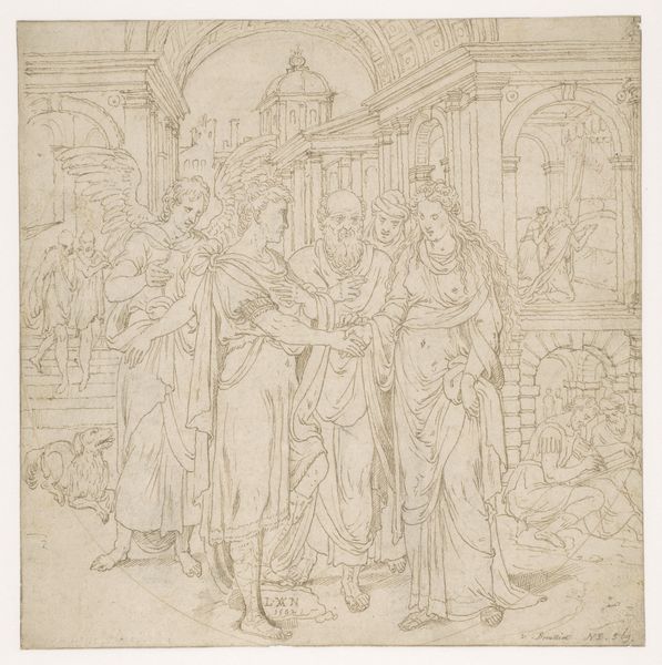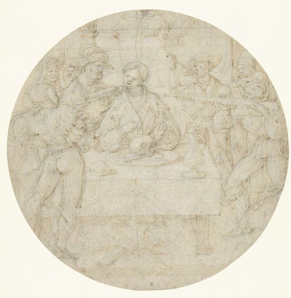Nicolaas Hogenberg created this delicate, circular drawing, “Christ at the Foot of the Cross, Mourned by Mary and John,” sometime in the 16th century. The monochrome palette and fine lines lend a sense of somber reflection. The composition is structured around the body of Christ, which lies horizontally at the base, creating a stark contrast with the vertical figures surrounding him. Notice how Hogenberg uses the ladder and the cross in the background to frame the scene, directing our gaze towards the central figures of Mary and John, whose grief is palpable in their downcast postures. The circular format, or ‘tondo,’ was popular during the Renaissance, often used to symbolize perfection and harmony. Here, however, it seems to contain the emotional intensity of the moment, focusing our attention on the intimate sorrow rather than any sense of divine resolution. This tondo, with its confined emotion, challenges the viewer to consider the contained, almost claustrophobic nature of grief.