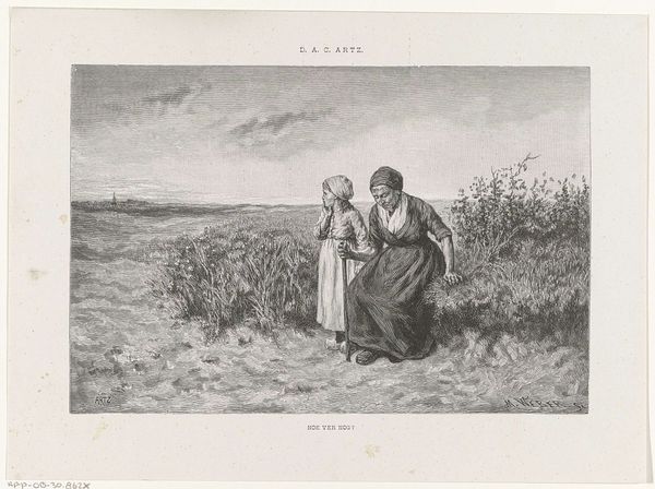Curator: Isidore Désiré Regnier's "Women Who Weed" presents us with a stark and honest depiction of labor. What strikes you first about it? Editor: The sheer relentless nature of it all. They're bent double, close to the earth, figures silhouetted against a low sun, or is that the moon? It feels almost biblical. Curator: Indeed. Regnier captures an enduring image of women's work. Notice how the landscape isn't romanticized; it’s a flat, seemingly endless field. The women become part of the very soil they tend. Editor: And that single standing figure in the background? She feels like a sentinel, a guardian of this arduous landscape, or maybe a memory. I wonder if the artist had a specific story in mind? Curator: Stories are often layered in images like this. The labor, the light, the land—they echo across time. These are realities that resonate still. Editor: It makes you contemplate the untold histories embedded in even the simplest of scenes. It’s more than just women weeding; it's an anthem.