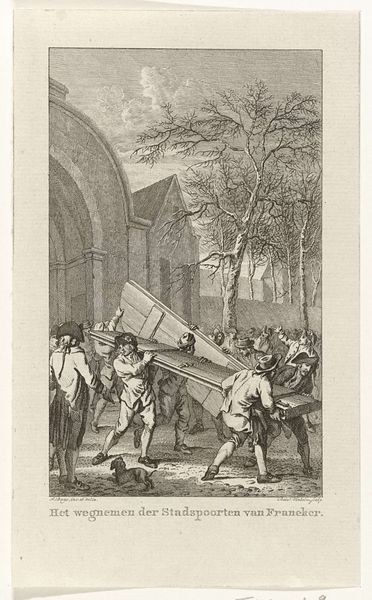 Editor: So, this is “Confrontation between citizen patrol and military patrol in Arnhem, 1784,” an engraving by Reinier Vinkeles, dating from between 1788 and 1790. The figures seem caught in a moment of intense anxiety, a prelude to conflict. How do you read this image? Curator: It's fascinating how Vinkeles captures a flashpoint in Dutch history through the lens of social tension. Consider the context: This print visualizes the Patriot movement clashing with the established order represented by the military. Editor: So it's not just a street scene, but a politically charged depiction? Curator: Precisely! Look at how the artist differentiates the two groups. The citizen patrol seems more dishevelled, less formally dressed, hinting at their grassroots nature. They’re defending their city, embodying emergent democratic ideals. While the military patrol looks aligned with more rigid, almost dehumanized by authority. Vinkeles implicitly questions power dynamics here. Who is the legitimate representative of the people's interests? Editor: I see. So the seemingly simple depiction is laden with ideological tensions concerning social hierarchy and governance. Curator: Absolutely. And that street becomes a stage for a struggle of autonomy versus authority. Note the realism, too. It brings what was then contemporary events directly into the public eye. Editor: It really makes you consider the power of print as a form of visual activism. I initially just saw the conflict, but now I see how the artist embedded so much political commentary. Curator: That's the beauty of art! It holds layers of meaning that resonate with us even centuries later as long as we see history in relation to the artwork, and vice-versa.