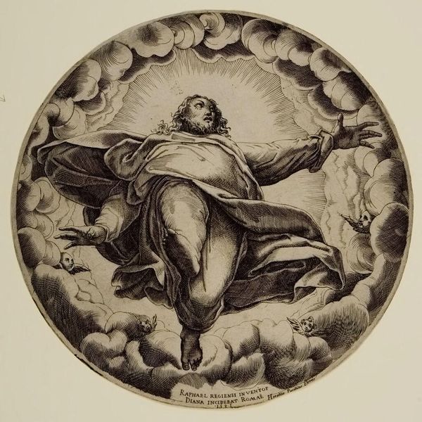Curator: Zacharias Dolendo's "Saint James the Lesser," a roundel print dating to around the late 16th century, offers an intriguing depiction of the apostle. Editor: It's striking how Dolendo captures this figure. The textures, from the beard to the drapery, create a sense of solemnity. What about the placement of that saw? Curator: The saw is, of course, an attribute associated with St. James' martyrdom. Considering the socio-political climate in Europe at the time, the print perhaps served as a reminder of faith amidst persecution. Editor: The print underscores the role of religious imagery as a means of shaping societal values and political discourse. Thanks for illuminating this piece. Curator: Indeed. This was a great dialogue.