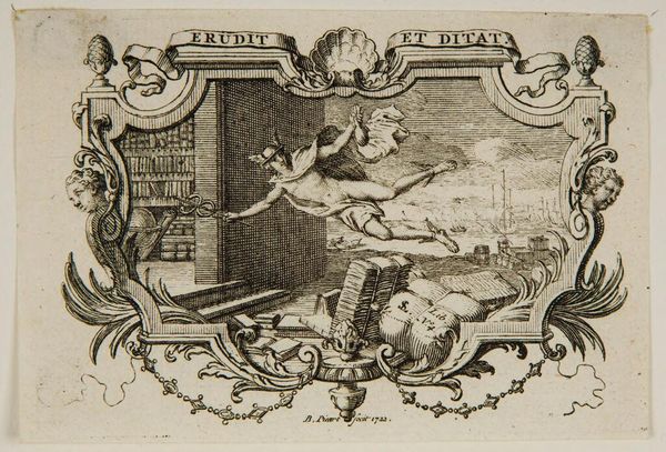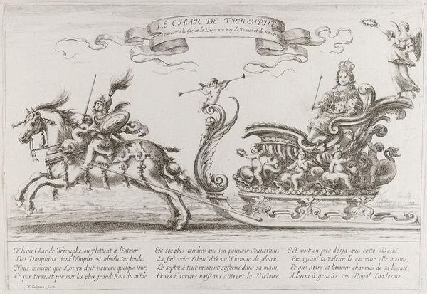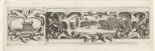 Curator: This etching by Jacques Callot, titled "Presentation of English Prisoners," captures a specific historical moment. The scene shows English prisoners being presented to a figure of authority. Editor: The mood seems celebratory, or at least triumphal, with detailed renderings of soldiers and weaponry framed by elaborate ornamental borders. Curator: Callot's work often reflects the political and social realities of his time. Consider the power dynamics at play here—the victorious presenting the defeated. Editor: It is difficult to ignore the uncomfortable tension in observing such a scene, and it raises questions about the glorification of conflict and the dehumanization of the captured. Curator: Indeed. Callot's decision to frame this event with such decorative elements serves to normalize, even sanitize, a brutal reality. Editor: I appreciate the detail and technical skill, but also feel a sense of unease, a reminder of how art can be used to perpetuate narratives of dominance. Curator: Yes, reflecting on the role of art in shaping public memory is what makes historical analysis so important. Editor: Absolutely. It's in unpacking these layers that we can truly grapple with the legacies of the past.