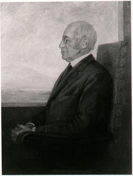Editor: This is a portrait of Cecil Kent Drinker by Pietro Pezzati. It feels very formal, almost like a monument. What symbols jump out at you? Curator: The sailboat in the background is a fascinating detail. It signifies exploration, perhaps a journey, but also a sense of established wealth and leisure. Cecil Drinker's gaze confronts us directly, demanding recognition. Editor: So, the symbols create a sense of a man who has both traveled and arrived? Curator: Precisely! He holds a small book, a hint of intellectual curiosity but held lightly, passively. What do you think about that gesture? Editor: Good point. It makes him seem reflective rather than active. I hadn't considered that. Curator: Every detail is a carefully chosen symbol, contributing to the overall narrative. Editor: I see the portrait in a whole new light now, as a story told through symbolic objects.