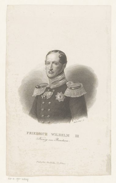 Editor: This is "Portret van Willem I Frederik, koning der Nederlanden," or "Portrait of William I Frederick, King of the Netherlands," by Pieter van der Meulen, made between 1815 and 1847. It's an engraving, which is something I haven't seen up close before, but the precision of the lines, achieved entirely mechanically, fascinates me. What can you tell me about it? Curator: This portrait offers a compelling look into the commodification of power. Consider the context: the printmaking process allowed for mass production and distribution of the King's image. How does this mass dissemination, using relatively inexpensive materials and a mechanical process, challenge the traditional exclusivity and aura associated with royal portraiture? Editor: It's interesting to think about a royal image becoming accessible to the masses. I guess I always pictured royal portraits as unique, commissioned pieces meant only for the wealthy elite. Curator: Precisely! And we should think about who produced this. The engraver, Van der Meulen, and the printing establishment--they become integral in shaping public perception. What implications might that have? Did they have any degree of freedom in depicting the King? Or was it tightly controlled to present a specific, favorable image? Also, note the text at the bottom - it speaks to production and price. Editor: So, instead of just seeing a portrait of a king, we're looking at a product of labor and materials, circulated within a specific economy of images? Curator: Exactly! We're witnessing the beginnings of modern image culture, where even authority is, in a way, manufactured and distributed. Think of it as an early form of propaganda, shaped by the processes of printmaking and consumption. What does it mean that Willem I allowed himself to be represented this way? Editor: This gives me so much to think about. I'm beginning to see portraits as active participants in the political landscape, not just passive representations of power. Curator: Indeed! By examining the material conditions and means of production, we can gain a much deeper understanding of the artwork's cultural function and social impact.