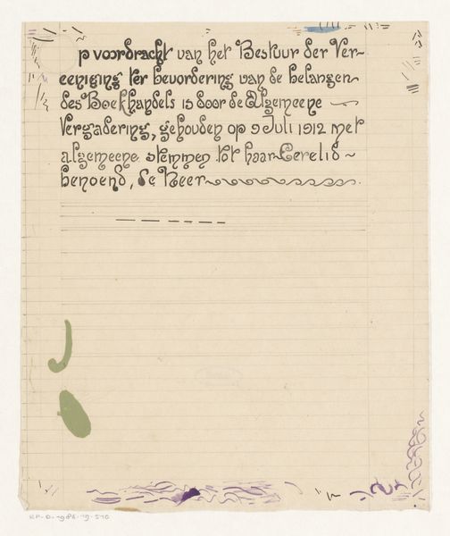 Curator: Here we have Reinier Willem Petrus de Vries' "Ontwerp voor een diploma van de Vereniging ter Bevordering van de Belangen des Boekhandels," created in 1914. It’s a fascinating example of graphic art. Editor: My initial thought? Elegant, but also a bit... bureaucratic? There's something about the meticulous linework combined with the formal layout that feels both beautiful and quite serious. Curator: Indeed. De Vries, working within the Art Nouveau style, often brought a refined touch to commercial designs. This is ink on paper, intended as a printed certificate for the Association for the Promotion of the Interests of Booksellers. Look at the gorgeous typography, even in this design phase. Editor: Exactly! That's where the interest lies for me. In thinking about this diploma, a certificate of achievement, in terms of access to literary spaces. Who were these booksellers, what kind of books were they selling, and who had access to them? What voices and histories might they have promoted, or suppressed? This becomes an entry point into wider societal questions about literacy and power. Curator: I love that reading. I see the Art Nouveau flourishes as less purely decorative and more as a statement. To me the stylized serpentine element anchoring the text offers both elegance and a sense of established, historical importance to bookselling as a profession. Editor: True, but doesn’t it also speak to the restrictions and structures that formal awards impose? While the serpentine detail might aim for elegance, the lines framing the central text look severe in holding the information to this space. Curator: It's a good tension. Ultimately, though, for me, it represents a beautifully rendered artifact of a specific time and place. This speaks to both an era and also of artistic commitment. It elevates a practical document through deliberate artistry. Editor: And for me, it’s an invitation to unpack the hidden meanings of a seemingly straightforward certificate and consider the bigger picture—how knowledge and recognition are circulated, and whose stories get told. Curator: That push and pull is what keeps art exciting! A fusion between something created long ago and a still impactful message.