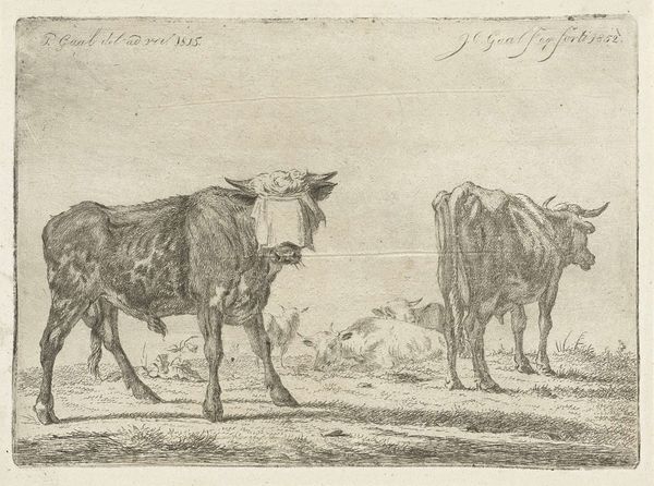 Curator: This etching by Karel Dujardin, titled "Ox and Calf," presents a seemingly simple pastoral scene. I'm immediately struck by the contrast in textures created solely through line work. Editor: Yes, you notice the way he's used a spare, almost brittle line to describe the animals' forms. How does this relate to the consumption patterns of the Dutch Golden Age? Curator: Well, Dujardin's focus on livestock points to the era's agricultural prosperity. The print itself, readily reproducible, became a commodity, circulating ideas about rural life and reinforcing social structures. Editor: Interesting. Prints like these also helped shape notions of the ideal countryside. They certainly romanticize labor. Curator: True, it's a curated vision of harmony between humans and nature, obscuring the realities of rural labor. But it's such a tangible object reflecting the economic realities of its time. Editor: Exactly, it's a constructed image serving specific societal functions that can be interpreted based on the current audience of the artwork. It's always interesting to see how historical context shapes something as simple as a pastoral scene.