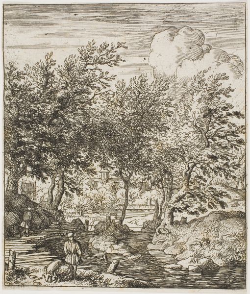 Allart van Everdingen created this print called ‘The Waterfall’, using etching on paper. The composition is structured around a dynamic interplay between nature and architecture. The artist uses dense lines to depict the rough textures of the rocks and foliage, which contrasts with the smoother surfaces of the buildings. The scene is divided by the diagonal flow of the waterfall, creating a sense of movement and depth. Everdingen destabilizes the traditional landscape by integrating architectural elements within the raw, untamed natural setting. This challenges the strict categories that separate the human-made and the natural. The waterfall itself becomes a signifier of the sublime, suggesting nature's power to disrupt and redefine our understanding of space. Consider the artist's signature in the lower right corner, a small yet significant mark that situates the artist within this landscape. It reminds us that the image is a constructed representation, an interpretation of nature filtered through the artist's eye.