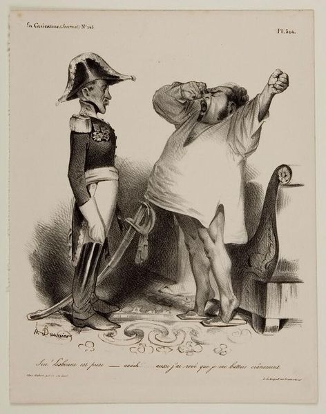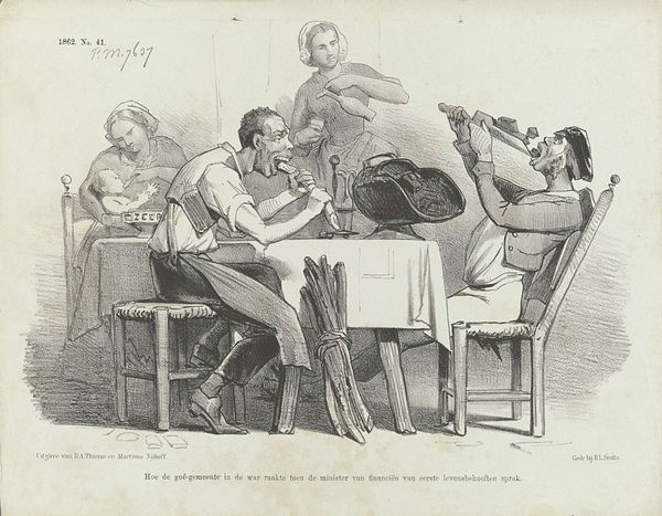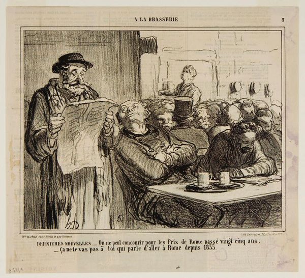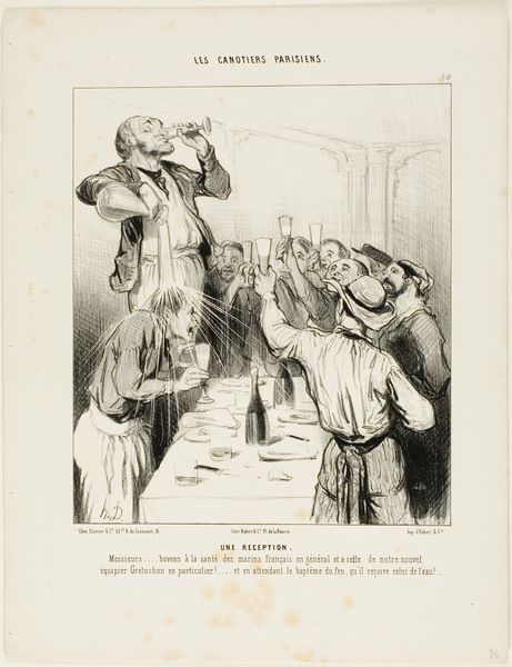 Curator: This is Honoré Daumier’s lithograph, "187th Toast: 'To the national guard of Astrakhan!'" Editor: Woah, total chaos! It feels like a drunken brawl masquerading as a patriotic celebration. I can almost smell the cheap wine and hear the boisterous shouting. Curator: Indeed, Daumier uses caricature to satirize the political climate of 19th-century France. The excessive toasting suggests empty rhetoric and the absurdity of power. Editor: Look at the guy slumped in his chair! Is he bored, disillusioned, or just plain drunk? It's like Daumier's poking fun at the whole idea of blind patriotism. Curator: Exactly, the print comments on the performative nature of nationalistic fervor and the social hierarchies inherent in such displays. Editor: It’s like he's saying, "Here we go again," another toast, another speech, another empty promise. I wonder what the 1st through 186th toasts were about? Curator: Considering Daumier's focus on social critique, we can surmise that previous toasts likely involved similar satirical undertones. Editor: Well, I know I'll never look at a toast the same way again. Thanks, Daumier, for keeping it real. Curator: A potent reminder of the artist’s commitment to social commentary.